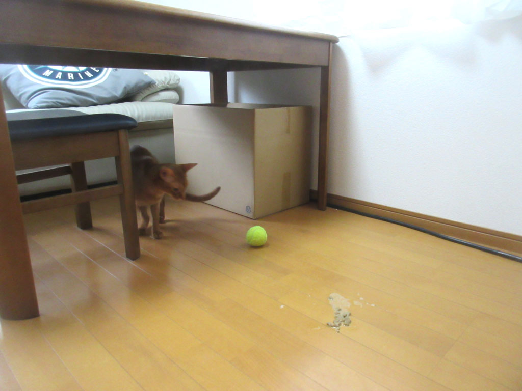 これは、今日の朝9時過ぎだったかな…、猫たちに2階で朝ご飯を食べさせて、2階の猫トイレを掃除して、それで、何も考えずに1階の猫トイレを掃除しようと下りて来たら、アビのすけが吐いとった…。
