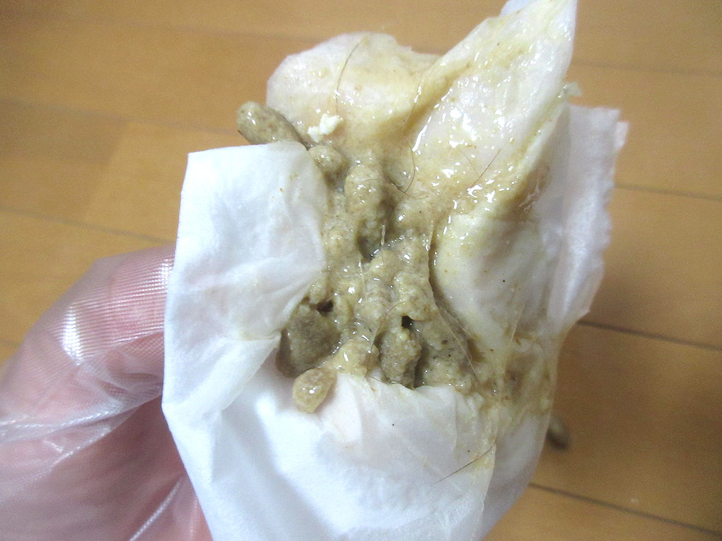 そして、アビのすけの吐いた物…、まぁ、いつもと同じで、胃の中で消化が始まりつつある時に吐いた様…。