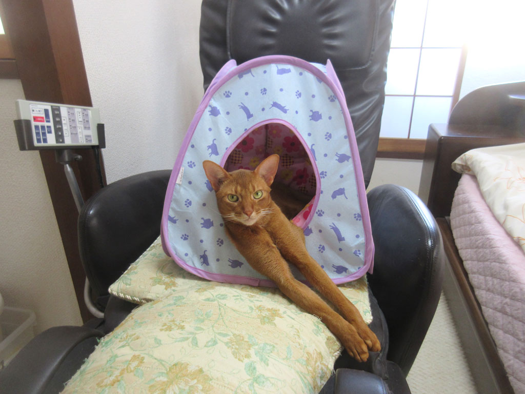 ここで寝ていたアビのすけ君。これは、8日も前の5/24(木)の朝一番の事でしたが、アビのすけ君、前日の晩、一旦、私の布団に潜り込みに来てくれたのですが、その後、脱出して、どうやらここで一晩を過ごしたみたい。