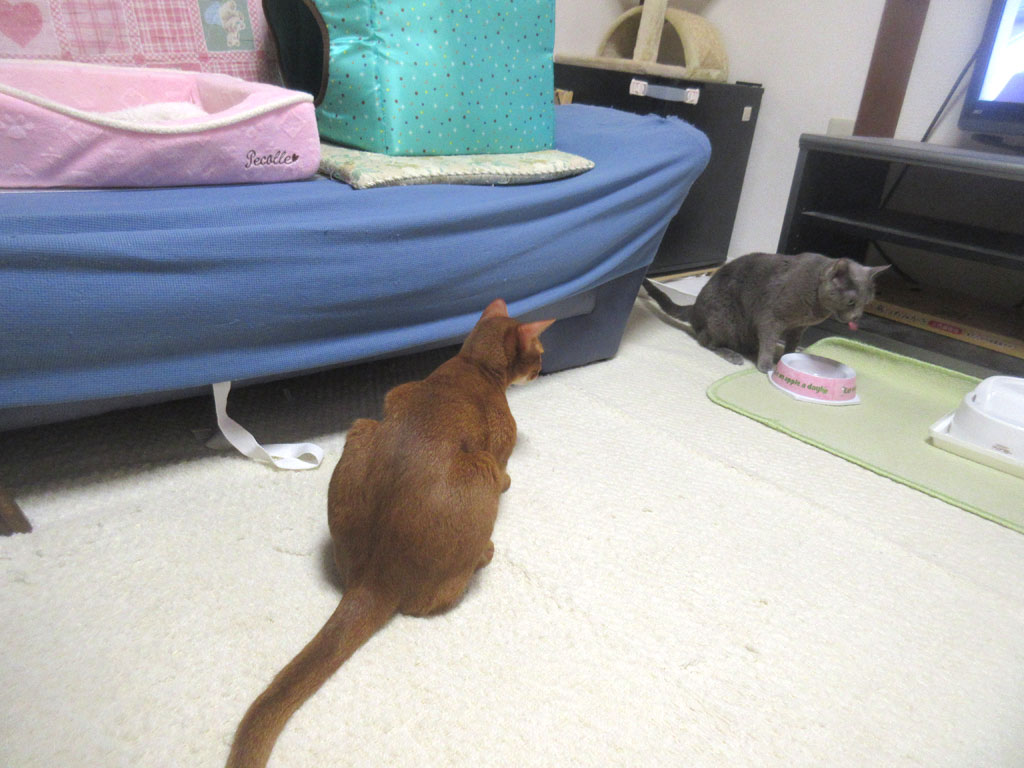これは、おとといの晩の事でしたが、早々に、自分の晩ご飯の1回目ご飯を食べ終えたアビのすけは、物欲しそうに舌なめずりをしながら、ご飯を食べているロシ子の事をガン見。(汗)