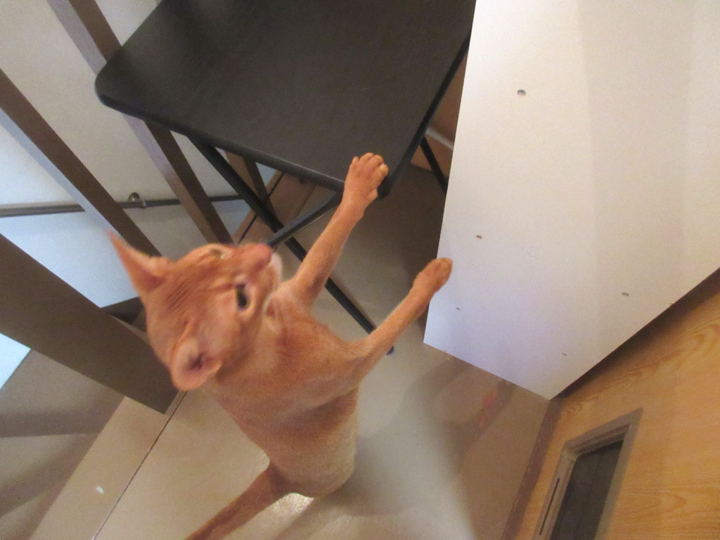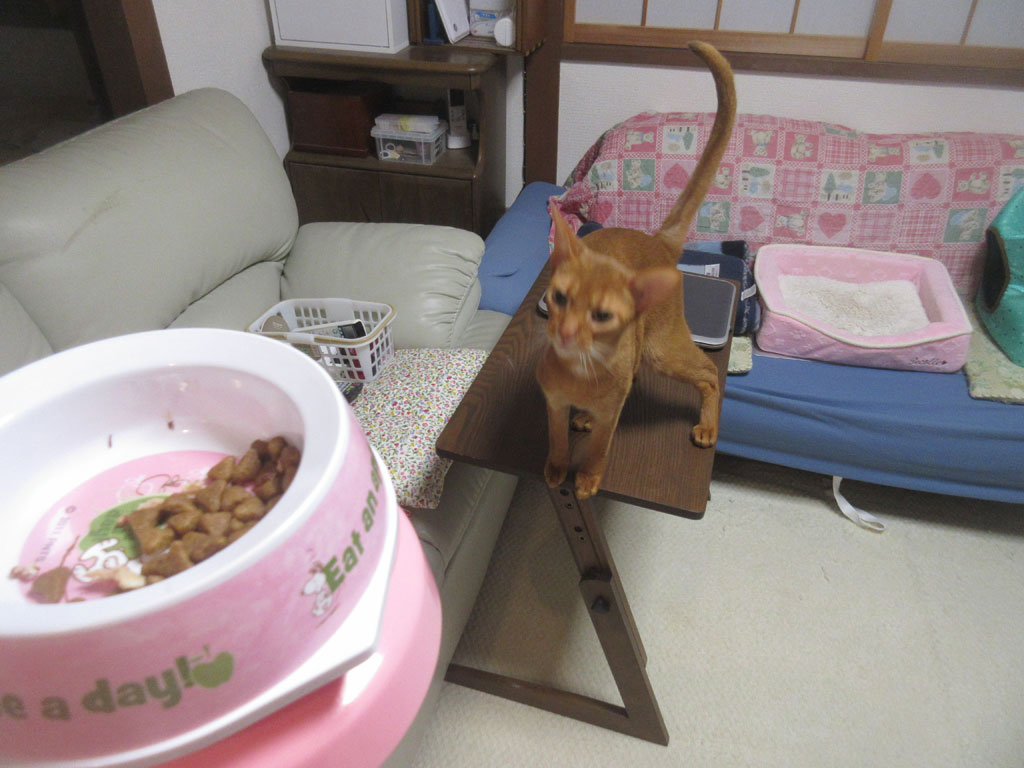 そしてこれは、約1時間後のアビのすけの2回目ご飯の時の風景…、戸を開けた瞬間から、アビのすけはこの体勢なのですが、もっと言えば、私が自分のご飯を食べ終わって、1階の洗面で歯磨きをし始めると、アビのすけはその音を聞き付けてオロオロとし始めて、私が階段を上がっている時には、もう、戸の向こうで大騒ぎしているアビのすけの音が聞こえるのです。