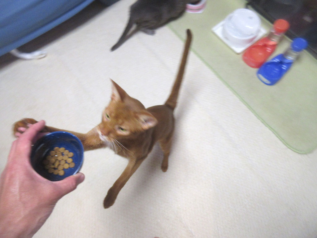 さて、まずは、アビのすけの晩ご飯の1回目ご飯の時の様子から…、アビのすけが見上げている視線の先には、アビのすけの1回目ご飯があったのですが、もう、アビのすけ君、待てません…、慌てふためき、立ち上がってしまう始末…。
