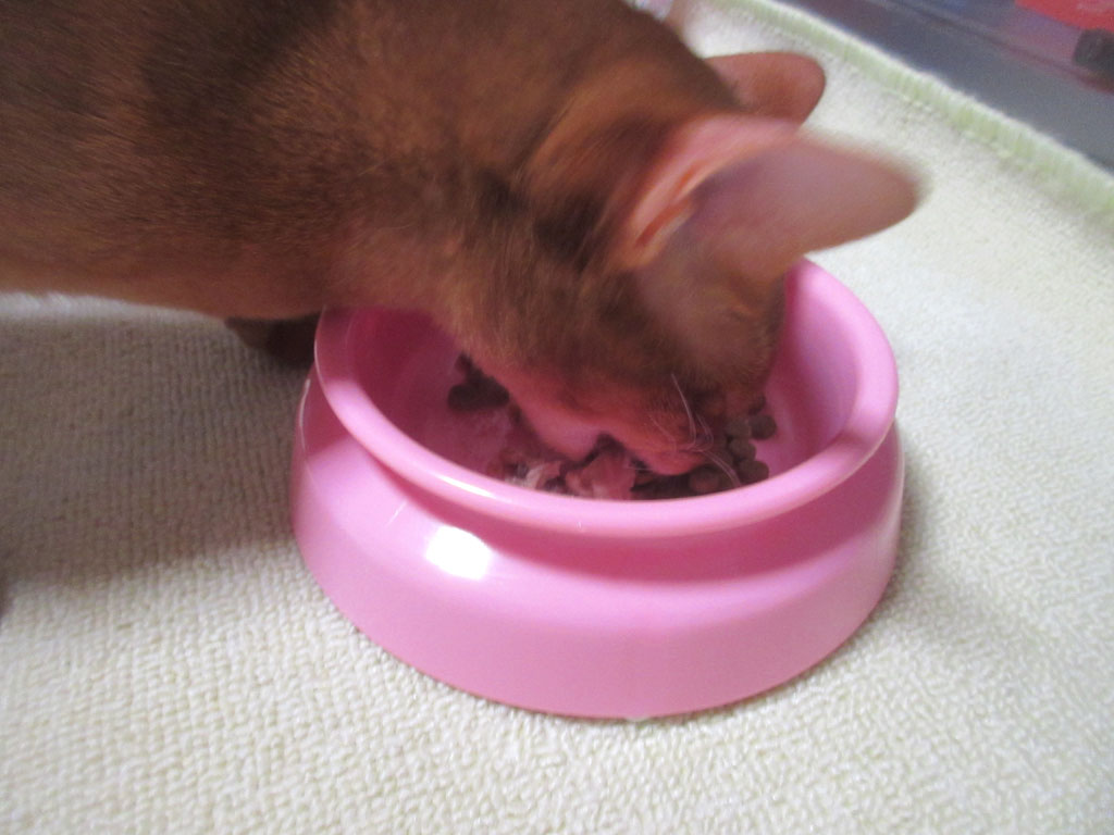そして、部屋に猫たちの晩ご飯を持って入るのですが、ご覧の通り、私の左手には、ロシ子の晩ご飯(食べ切っていない分)のお皿と、アビのすけの2回目ご飯のお皿を重ねて持っていて、まずは、上の方のロシ子のご飯のお皿を定位置に置いてあげ、ご飯を食べる様、優しくロシ子をいざなってあげるのです。