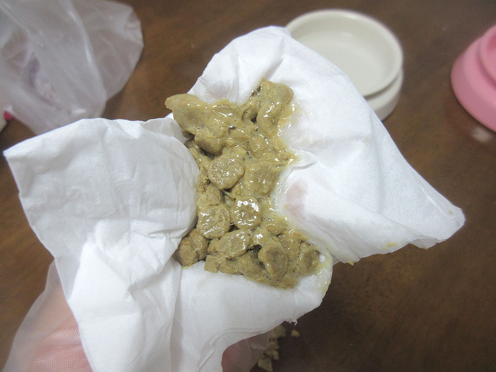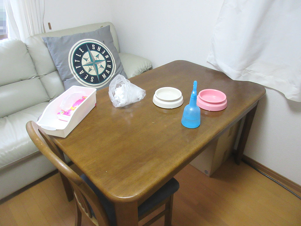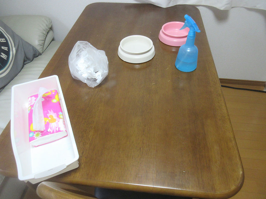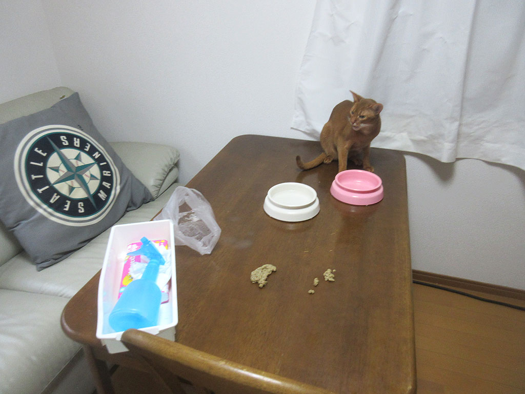 今回も、掃除のしやすいテーブルの上で吐いてくれて、ある意味、とってもお利口さんなアビのすけ君…、そのおかげで、5分も掛からず、あっという間に掃除が終わりました。