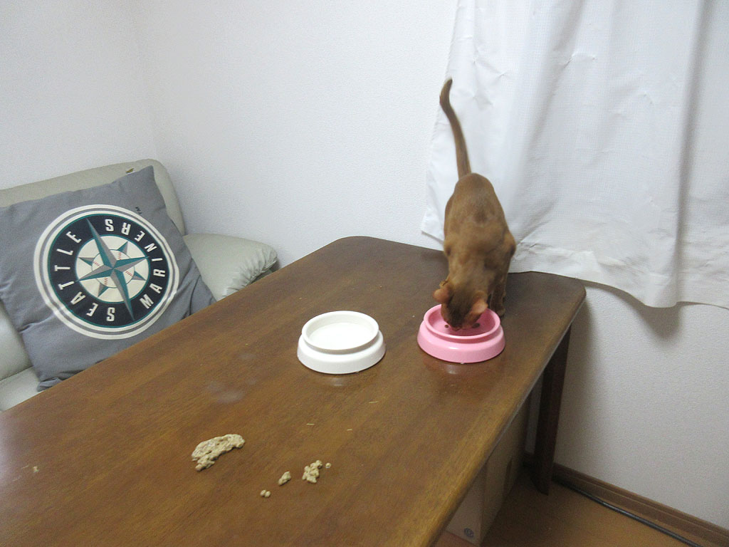 暫くすると、やはりアビのすけ君、残っている朝ご飯を食べに行ったぞ…、吐いた尻からご飯を食べるって、まさに、「僕、一気食いをして吐きました。」って言ってる様…。