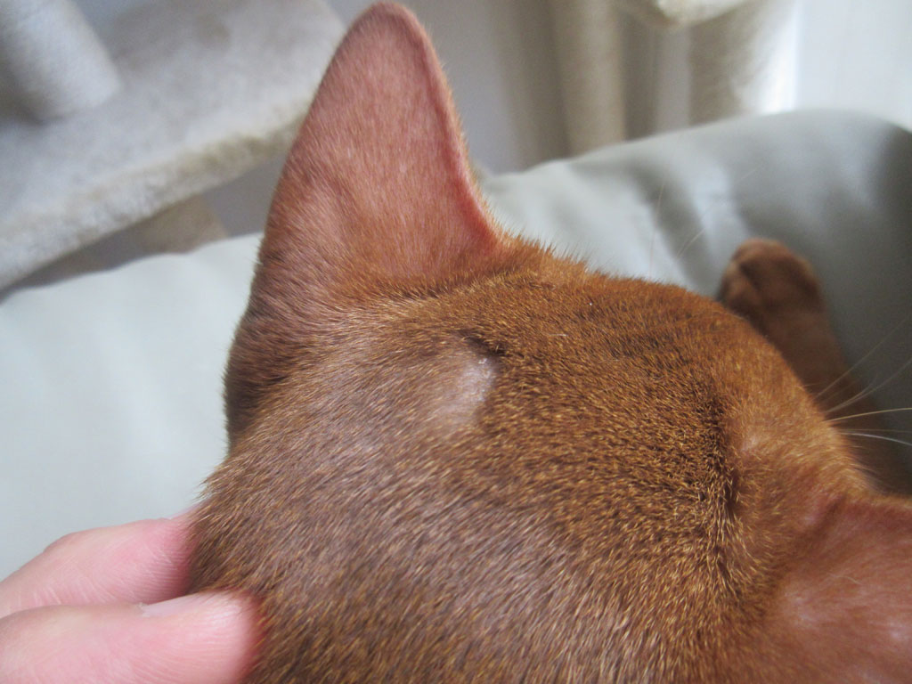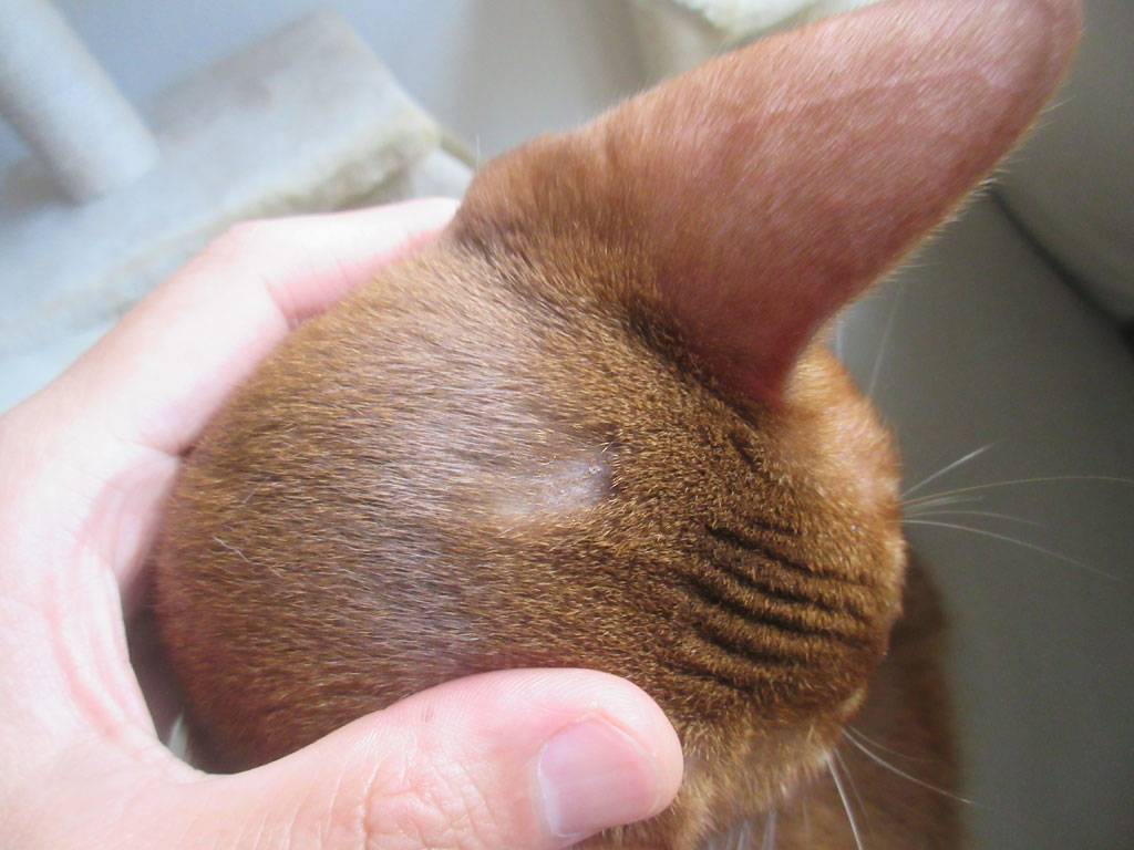 これまた、肝心の傷の部分がボケてしまっていますが、どうやら、傷自体は癒えている様…、でも、このハゲは、当分、毛は生えて来ずにハゲのままだろう…。