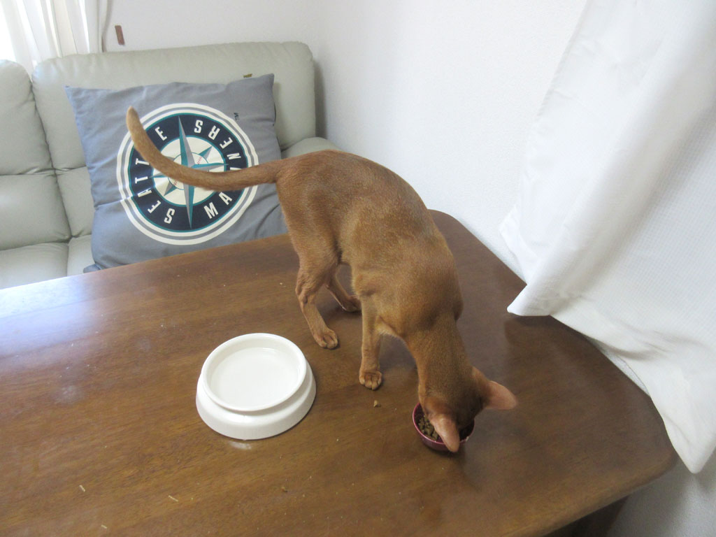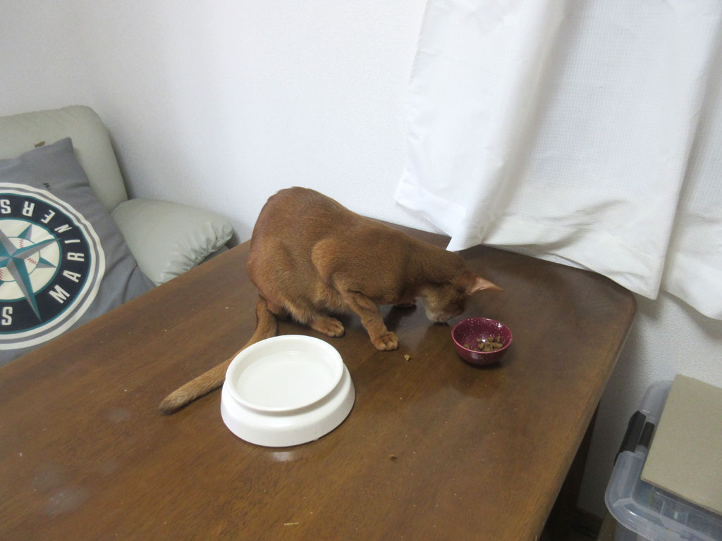 最近のアビのすけは、缶詰を食べさせた事で舌が肥えてしまったのか、あるいは、小皿が食べにくいのか、お昼ご飯を一気に完食する事もなく、と言うか、ファーストコンタクトでカリカリに口を付けない程なのですが、暫く経つと、やはりご飯の場所に戻って来て、またガサツに食事を再開。