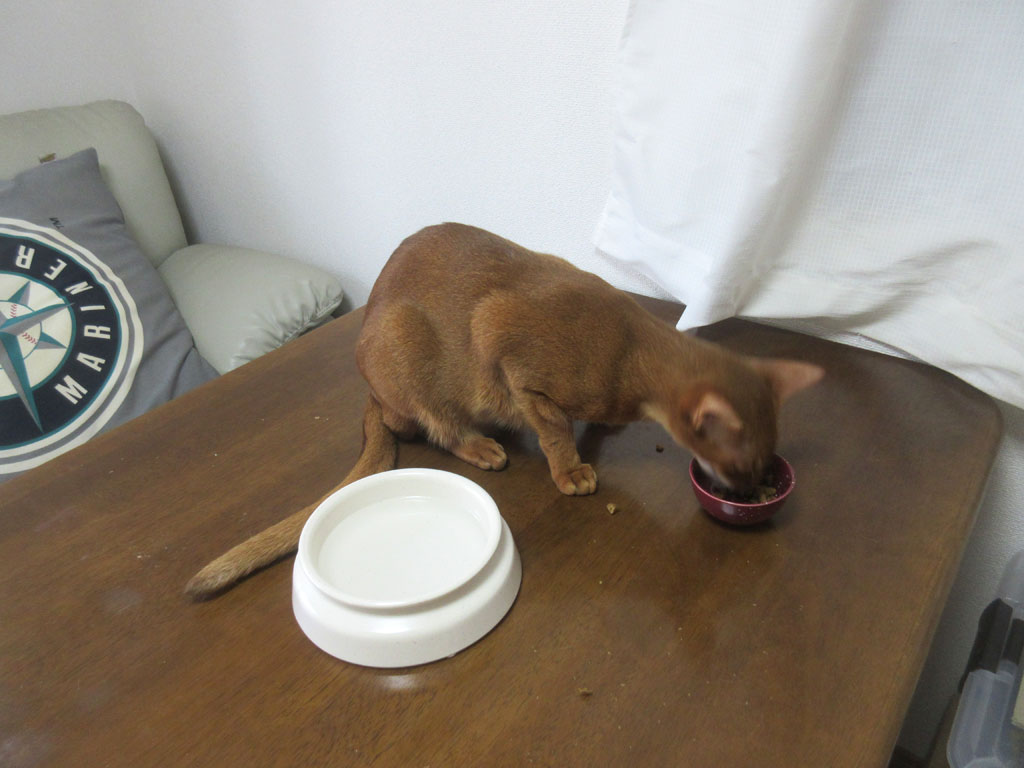 ロシ子の様に、お上品に、お皿の中に顔を突っ込んで、そのままの状態が噛んで飲み込んで欲しいのですが、アビのすけは男の子で横着なので、お皿に顔を突っ込むものの、必死に食べるので動きが激しく、顔をお皿の外に出してポロポロとこぼしてくれるのです。