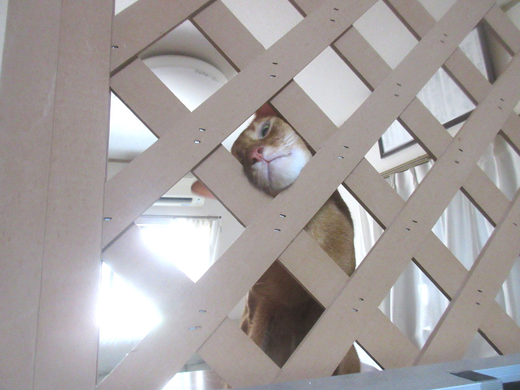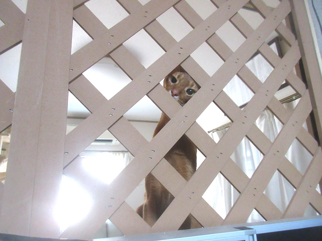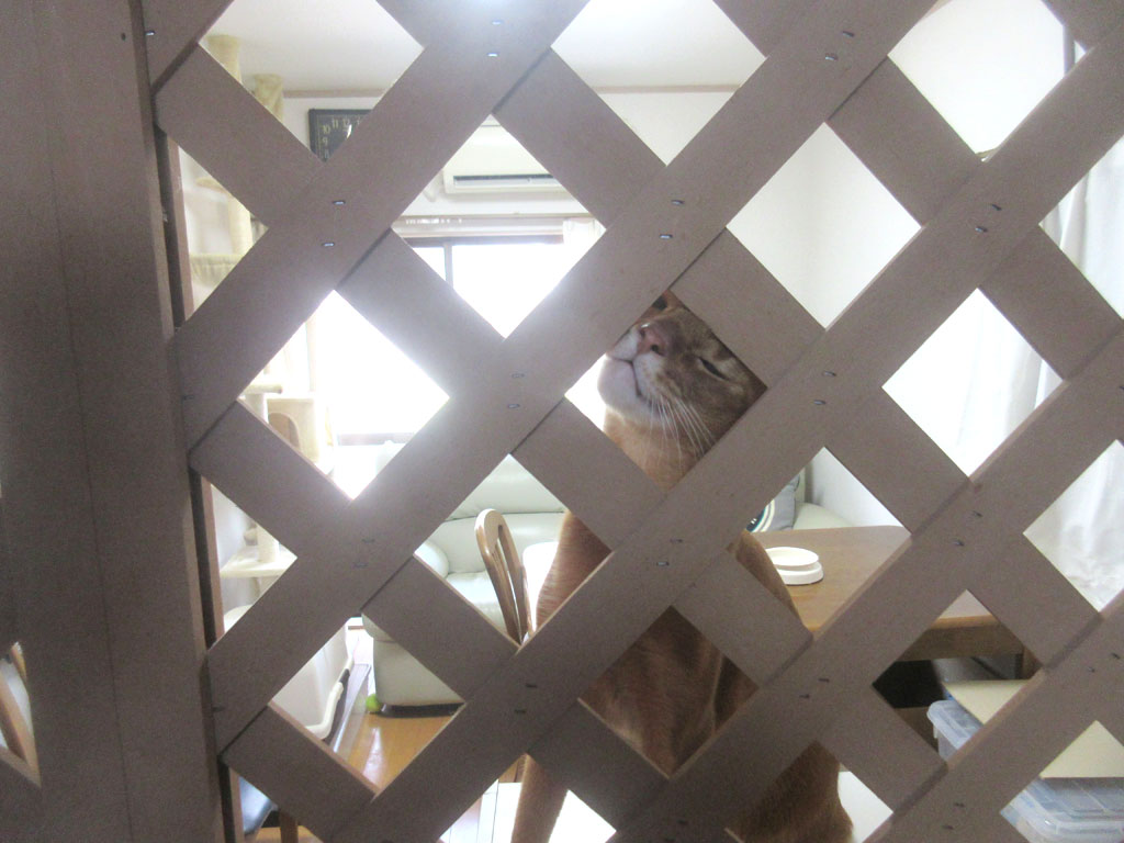 ラティスの間に顔を突っ込もうとして、それで、こっちに来たい、ご飯を食べたいって、必死のパッチのアビのすけ君。