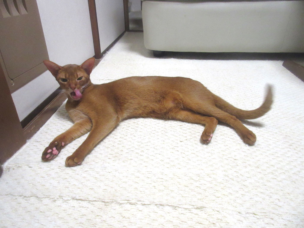 晩ご飯を食べたばっかりだったから、他の猫ちゃん同様、ただ単に舌舐めずりをしていただけなのですが、アビのすけのおバカな性格を知っているだけに、おバカなアビのすけにしか見えないんだわ…。(汗)