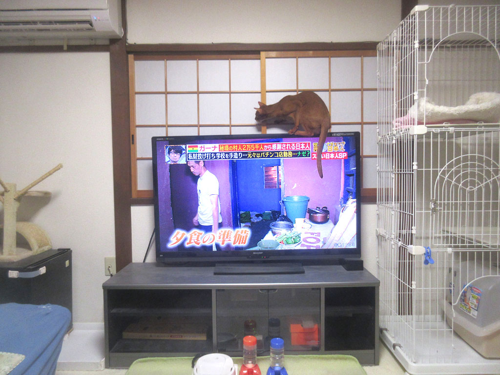 私は驚いて、パッと目が覚めてしまって、一体、何が起こったのかとアビのすけを見たら、何とアビのすけがテレビを駆け上がっとった…。