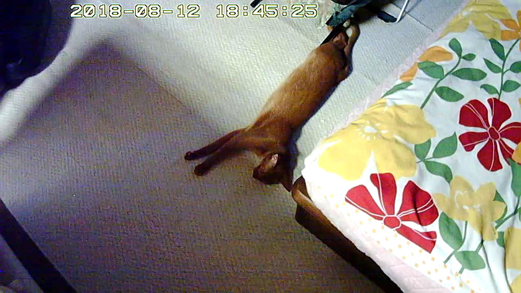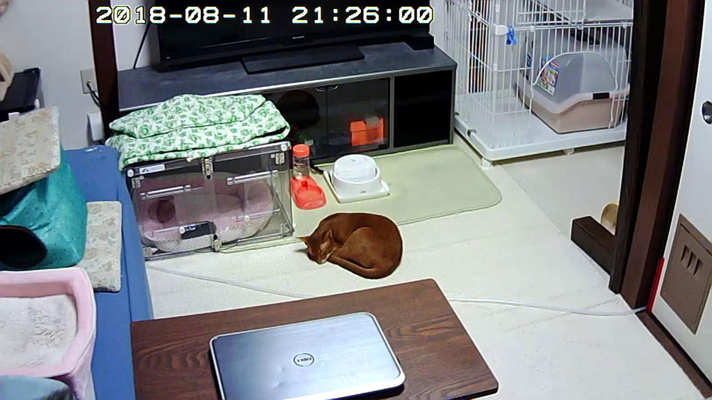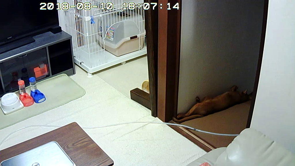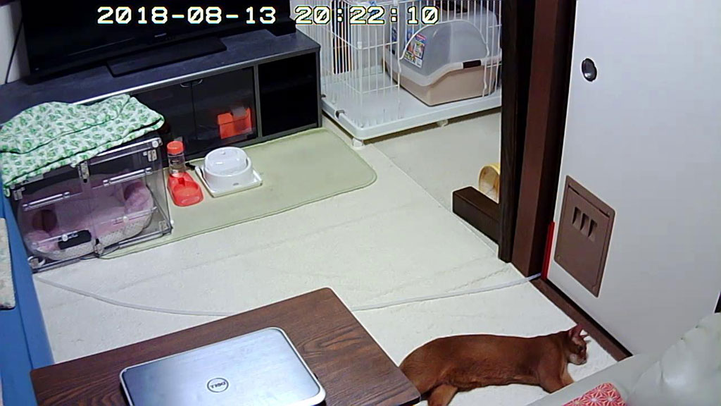 そしてこれは、3日前、8/10(金)の夕方のアビのすけ君…、生暖かい空気に包まれたこの場所で、伸びて寝ていたアビのすけ君。