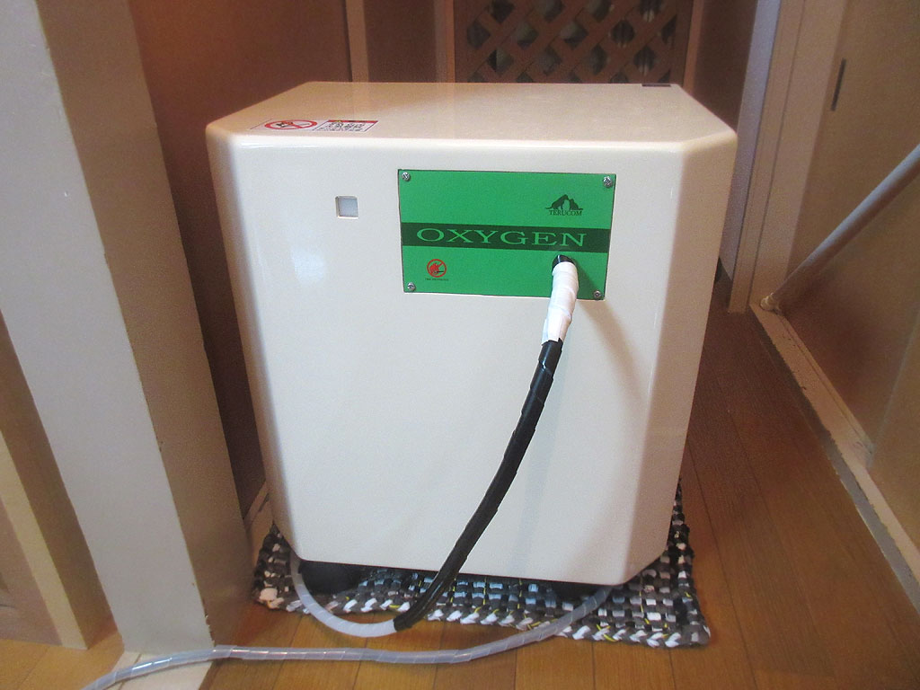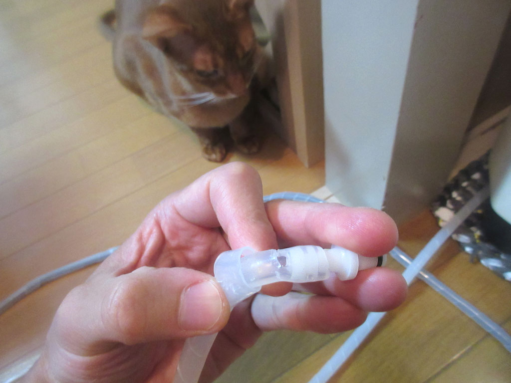そして、ホースを酸素濃縮器にカチッとはめて、酸素室の再セッティングが終わったのですが、このホースの飛び出具合は、やっぱり、めっちゃ猫たちの目に付くし、猫たちの格好の噛み噛みポイントだと思うんだけど…!?