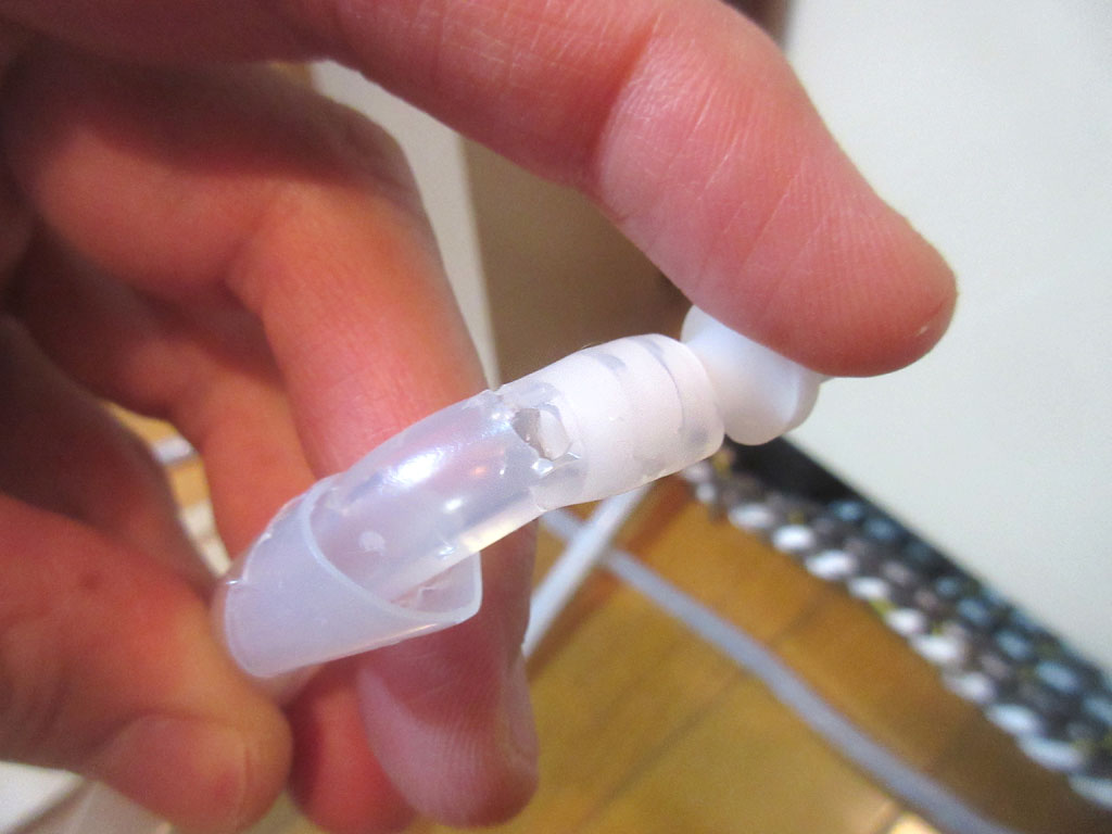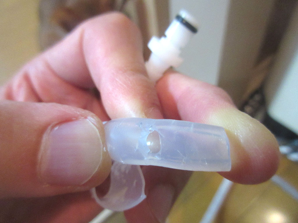 酸素濃縮器にカチッと繋ぐジョイント? を外してみると、ホースの先から1.5cm位の所に大きな穴が…。