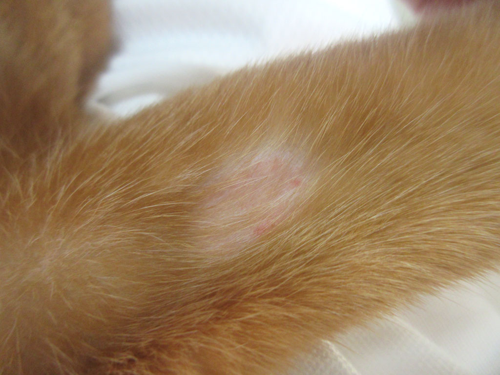 まずは、そのアビのすけの腕の皮膚炎をチェック…、これ、アビのすけ君の右腕ですが、肘の少し上のら辺に、ちょっと毛の薄い場所があるでしょ…。