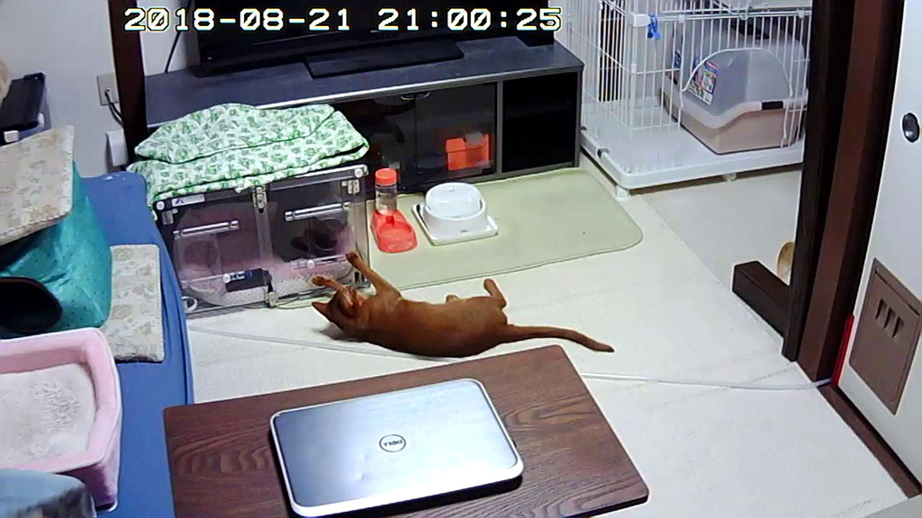 これは、3日前の8/21(火)の晩の事…、いつもの通り、晩8時頃に猫たちに晩ご飯を食べさせて、その後、私は一旦、1階に引き上げたのですが、私のいない空間で、これもいつもの通り、ロシ子が入っている酸素室に忍び寄るアビのすけ君。