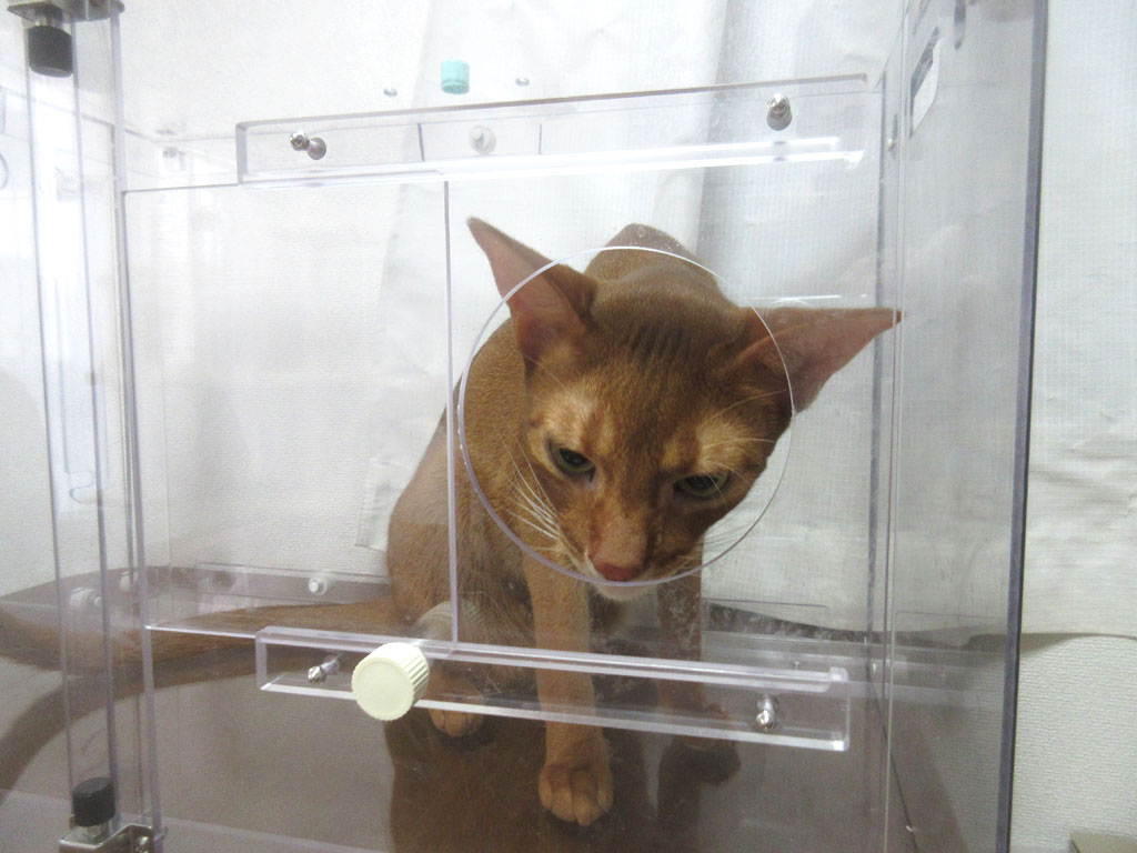 警戒しながらも、自分から酸素キャリーの中に入って行って、やっぱりアビのすけは好奇心旺盛なアビシニアンの男の子。