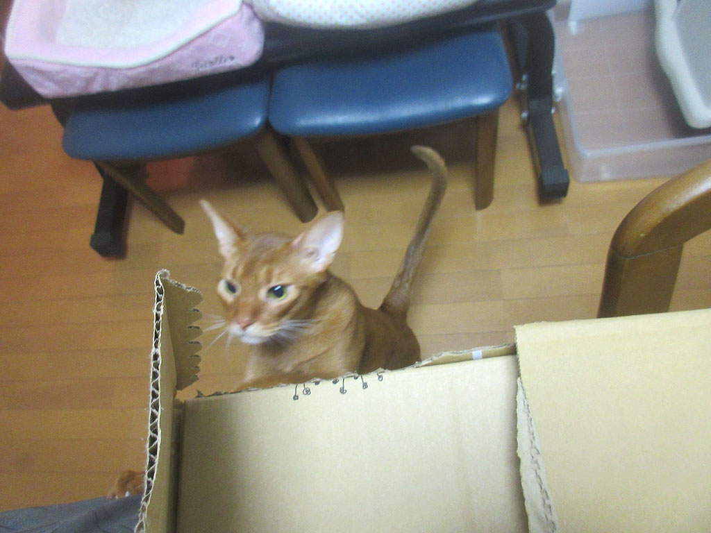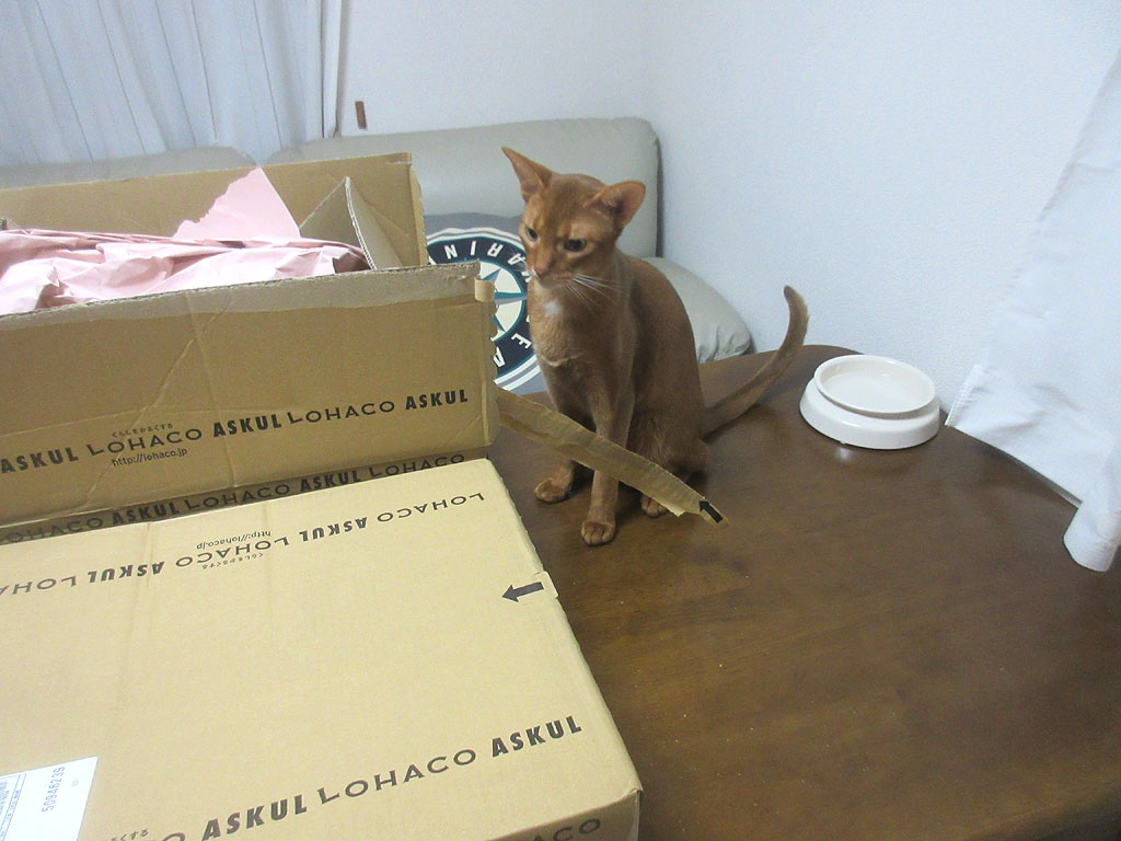 いつもは、Amazonの定期お届け便で頼んでいるのですが、今回は欠品との事で、仕方なく、他の所から買ったのですが、そんな事はさておき、その砂の梱包の箱を開封してかたずけようと思ったら、もう、このブログに何回も書いて来ましたが、この男、アビシニアンのアビのすけ君がやって来た。