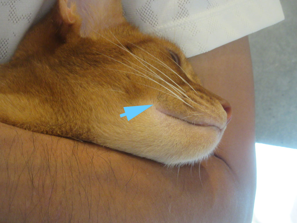 アビのすけの口の上に顎ニキビ。そしてついでに、アビのすけのボディ全体をチェックしていたら、何と、矢印の部分、ちょっと分かりにくいですが、アビのすけの右口角の上辺りに、黒いゴマ粒がたくさんの顎ニキビが…。