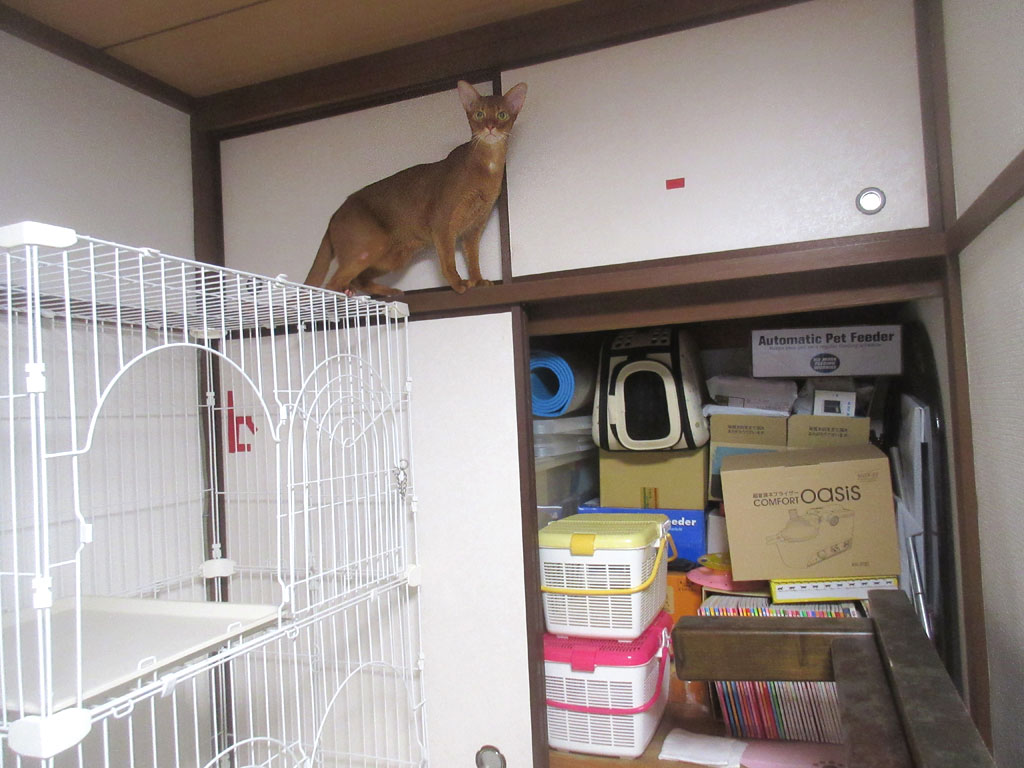 押し入れを開けたら、ケージの天井に上がって、押し入れの中に入りたそうにしていたアビのすけ君。