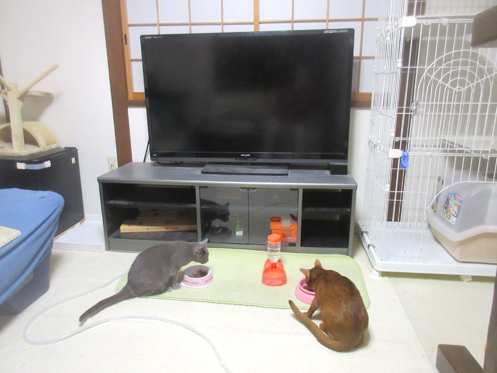 そしてこれは、アップ漏れの写真、約2週間前の10/22(月)の我が家の猫たちの晩ご飯の風景…、今日もロシ子は調子が悪く、ほんと、ロシ子にも、元気になって欲しいです…。