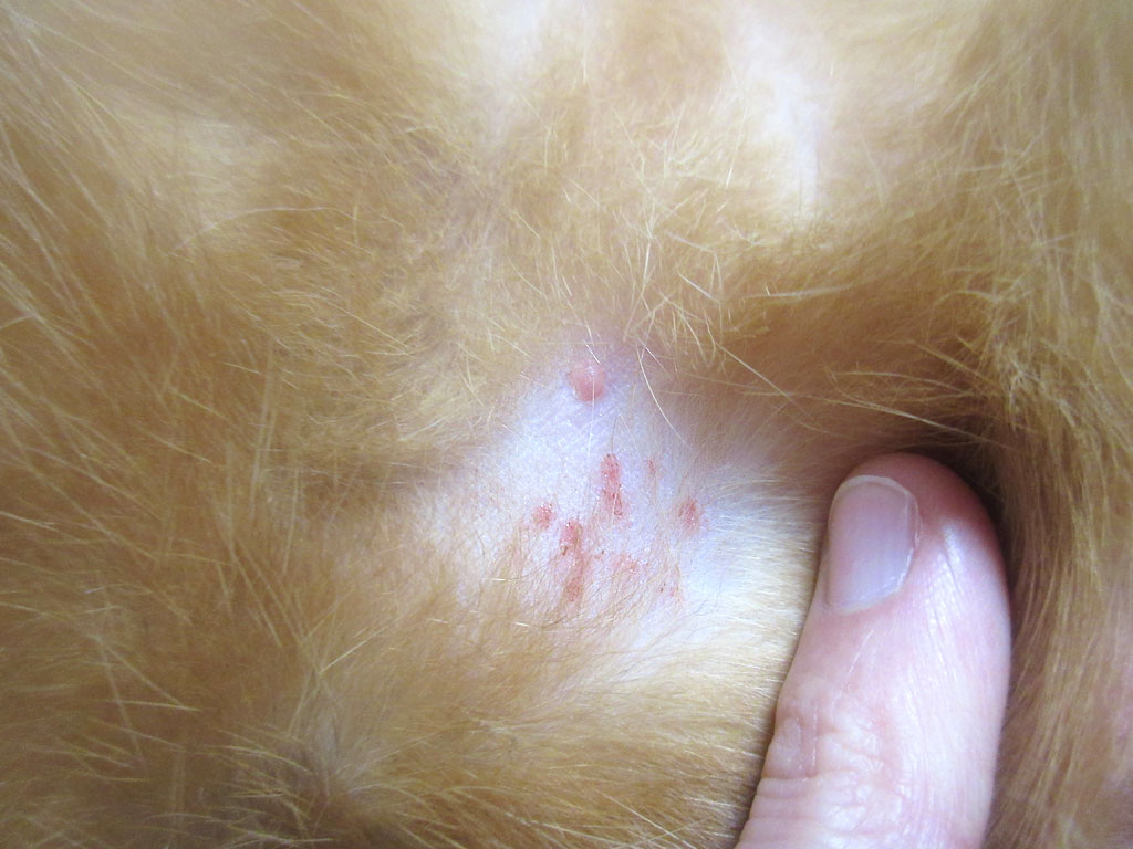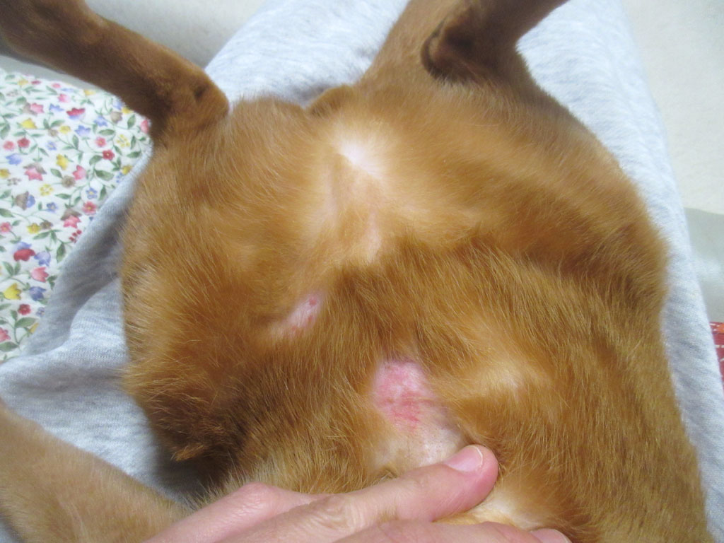 この2か所、以前と言うか、直近で出来ていた皮膚炎の跡地で、下側はピンク色になってしまっているし、上の方は、以前、最後に確認した時も、こんな感じでかさぶたが残ってて、あの時から完治に至っていなかったのか…。