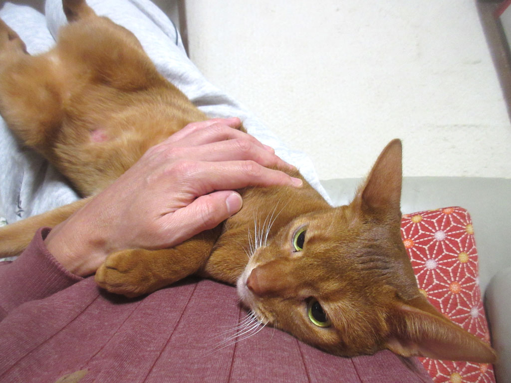 これは、3日前の11/9(金)の晩の事、この日の前日に、アビのすけの皮膚炎が復活しているかも知れないって事を発見し、翌日のこの日、アビのすけにモメタオティックを塗ろうとアビのすけを取っ捕まえたのです。