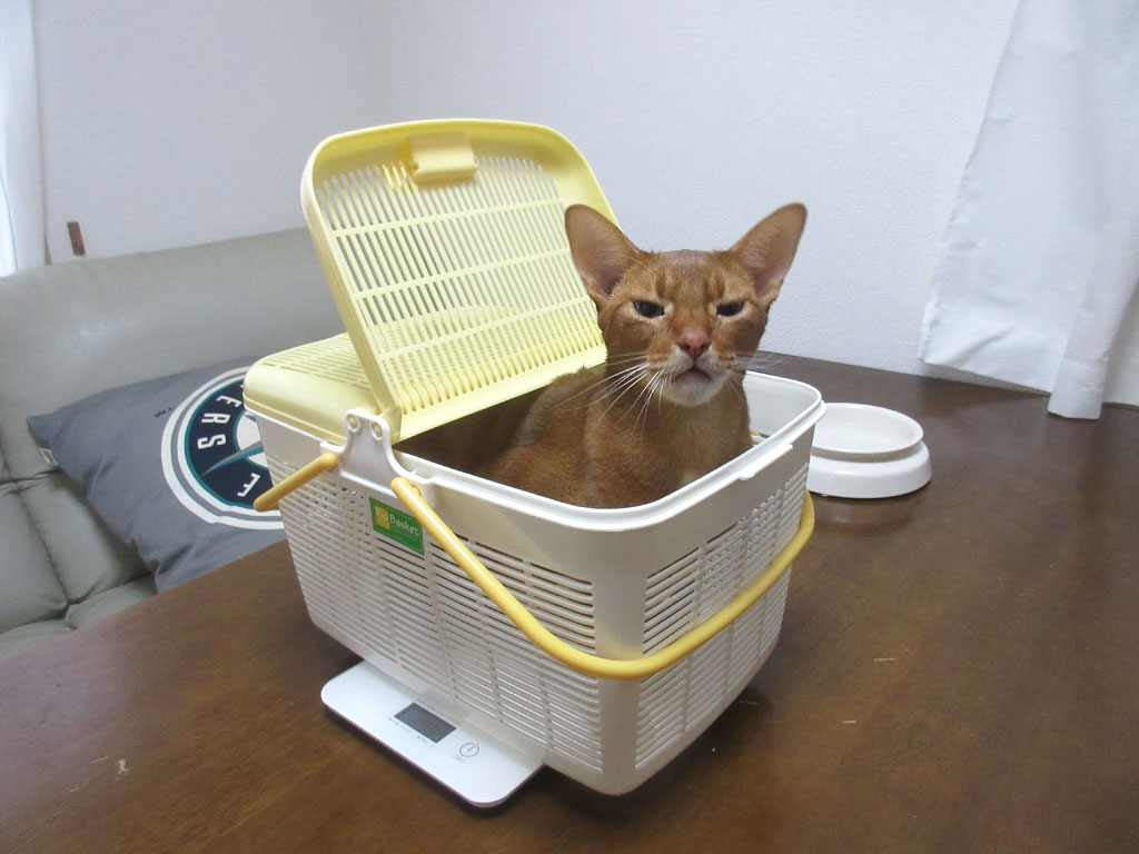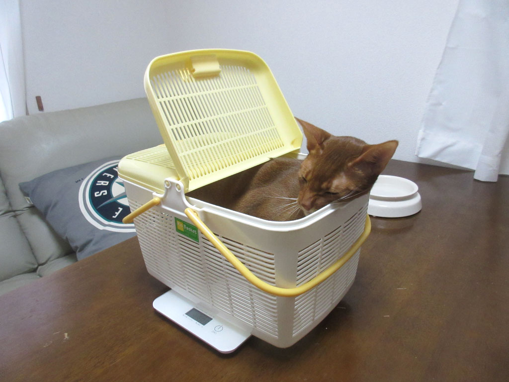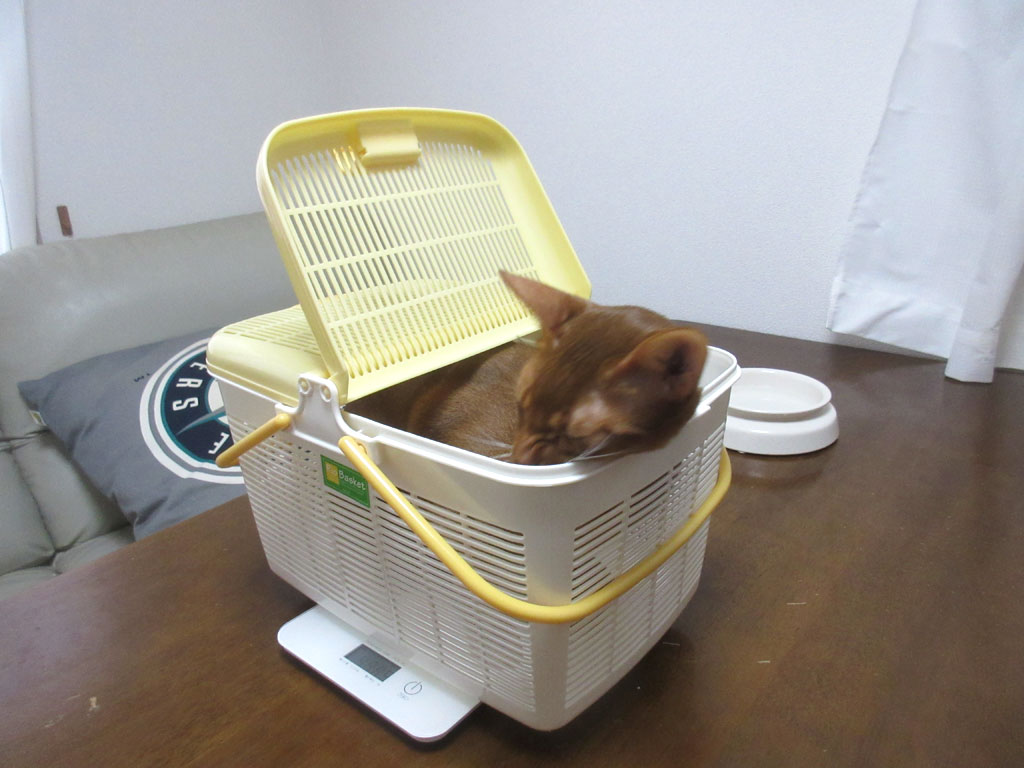 アビのすけの体重測定の様子。そして、アビシニアンのアビのすけ君の体重測定の様子。