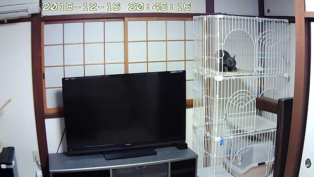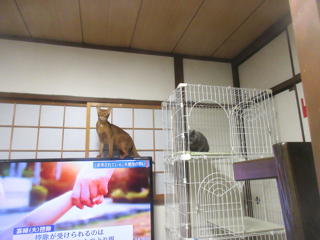 そしてこれは、4日前の12/13(木)のいちびっているアビのすけ君…、この直前、ロシ子を追いかけていて、ロシ子はケージの中へ、アビのすけはテレビの上に飛び乗って、横からロシ子に茶々を入れていて…。