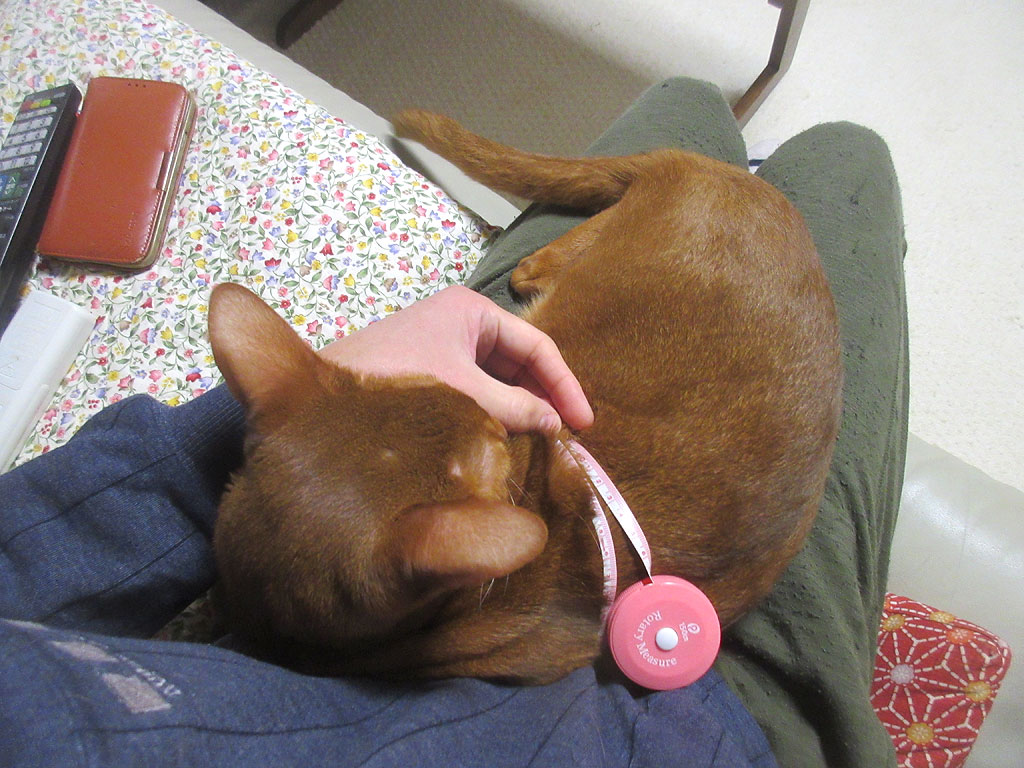 まずは、アビのすけの第9肋骨回りから…、と言っても、私一人で測っている事だし、嫌がるアビのすけを押さえ付けてダッシュで測ったので、正確に第9肋骨回りを測れたかどうかは甚だ疑問…。