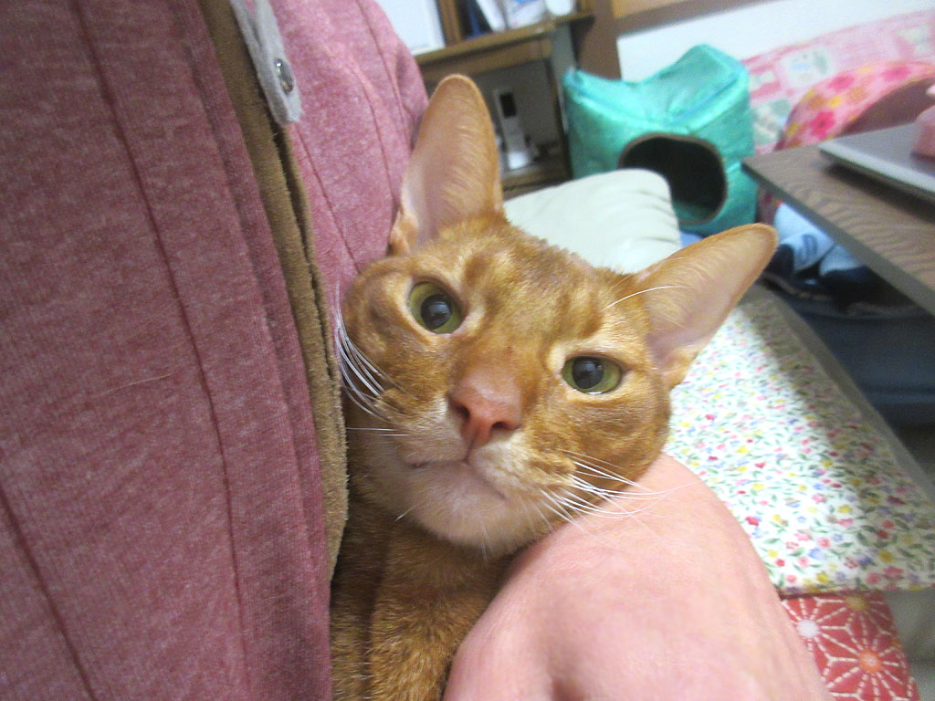 甘えん坊のアビのすけ君。まずはこの写真から…、これは、おとといの晩11時前のアビのすけ君…、私が布団に入るのを、今か、今かと待っていたアビのすけ君。(笑)