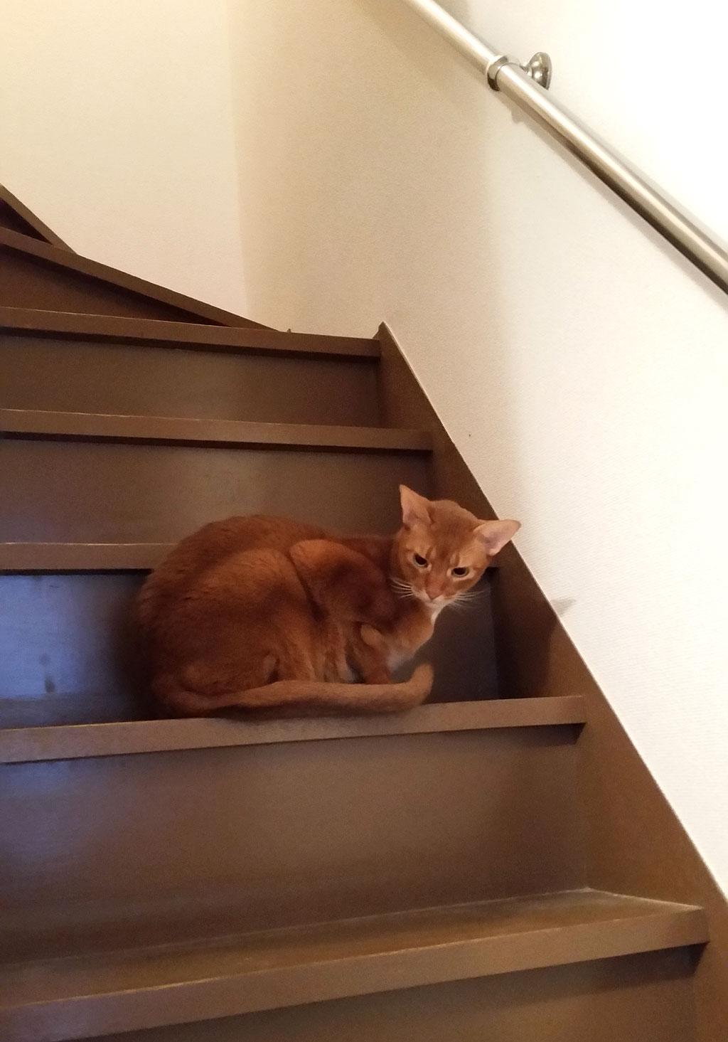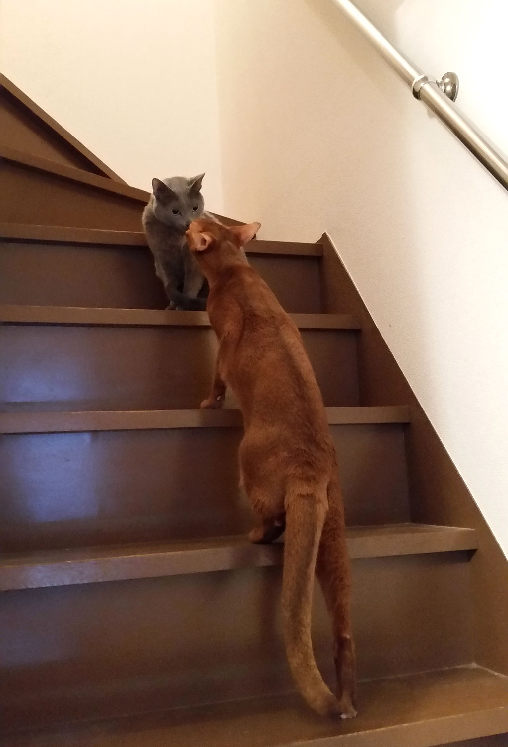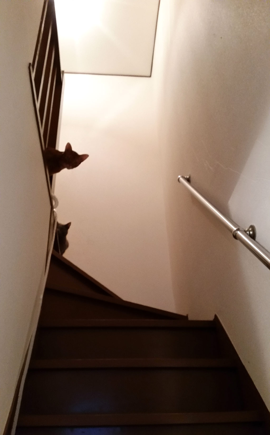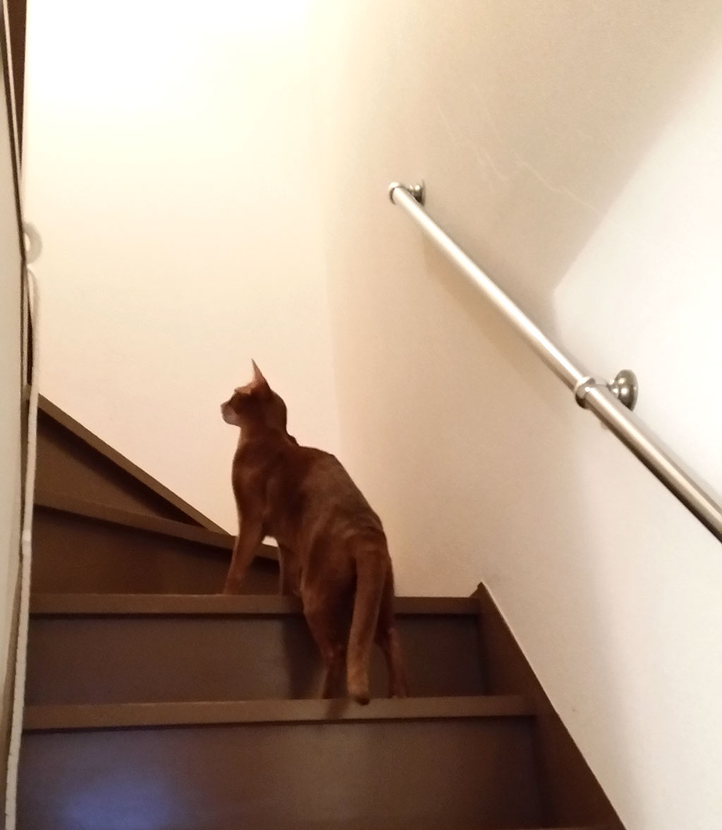 この写真、とっても残念だったのですが、2階の踊り場の所の電気が逆光になってしまって、猫たちの顔の表情が写真では見えないのですが、この時のアビのすけの顔の表情がまさにひょっこりはんの顔をしていて、本当に笑ってしまったのです。(笑)