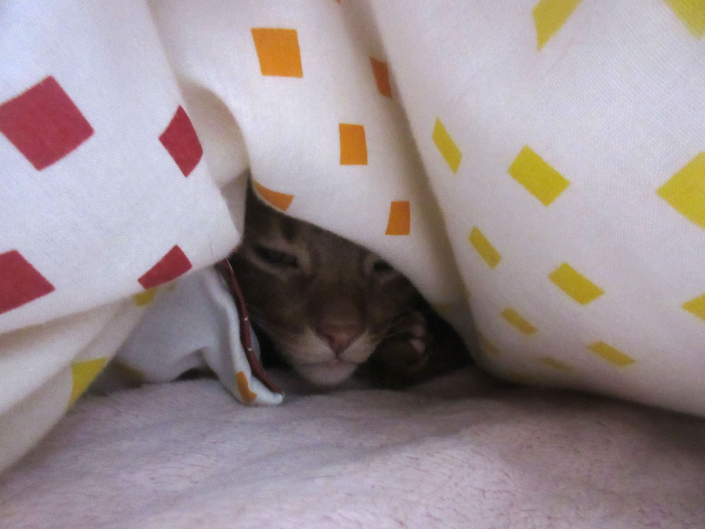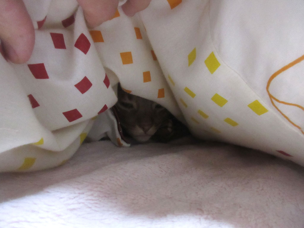 布団がもっこり…、やっぱりアビのすけ、ここで寝てるな…、思った通りの行動をするアビのすけ君。(笑)