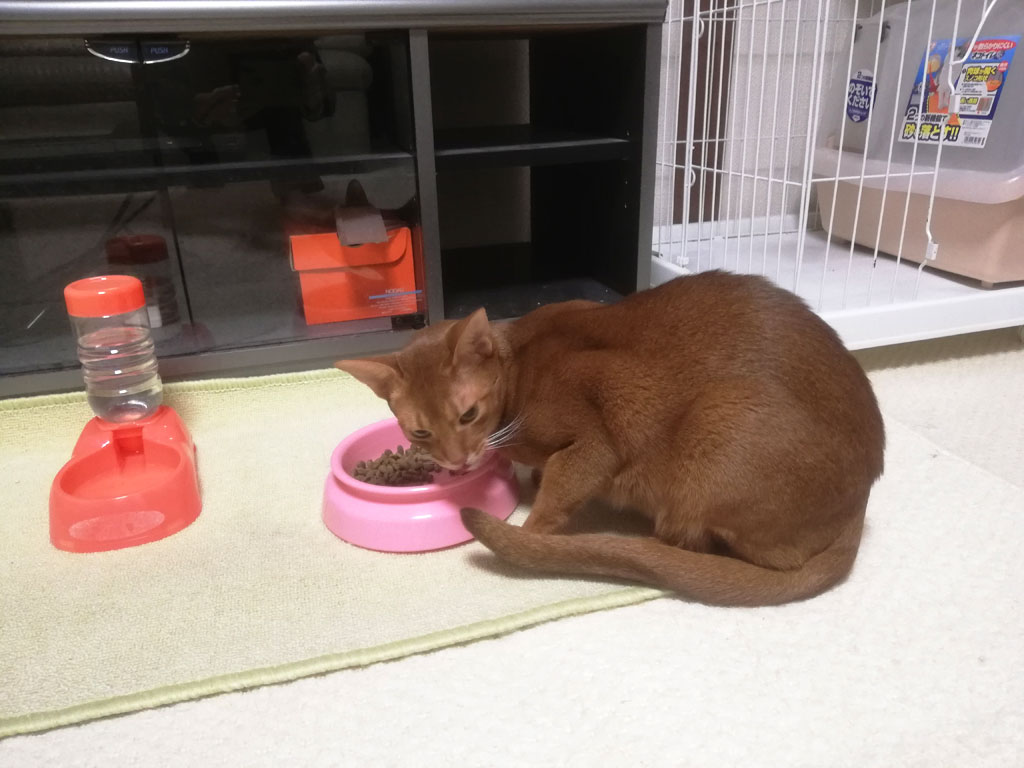 そして、皮膚炎をチェックして、皮膚炎にモメタオティックを塗った後のアビのすけの晩ご飯の様子。