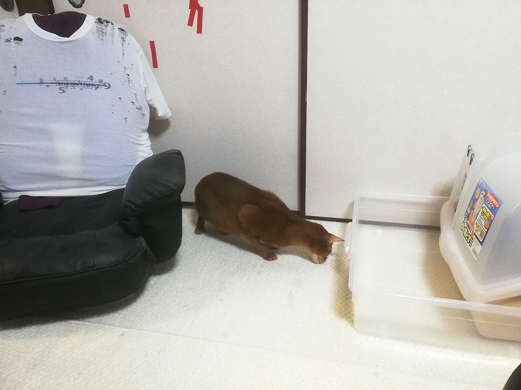 ゲロを匂うアビのすけ。そしてこれは、おととい、1/25(金)の深夜1時半前…、この少し前にロシ子がここで吐いてしまい、そのゲロの跡をアビのすけが嗅いでた様子。