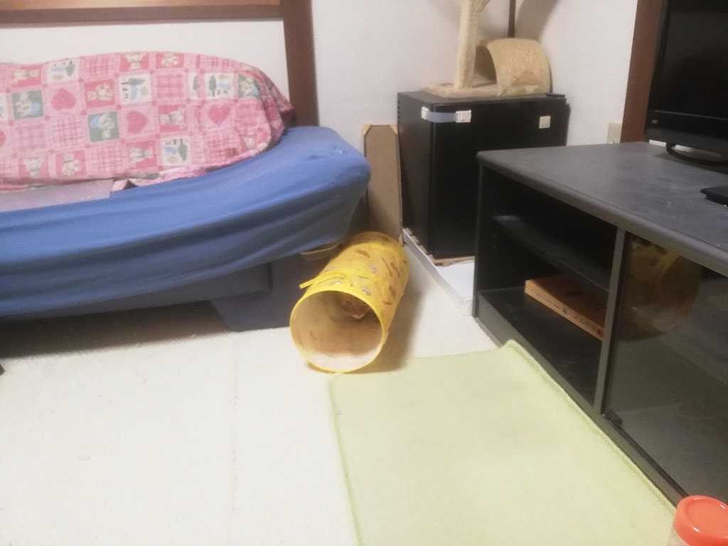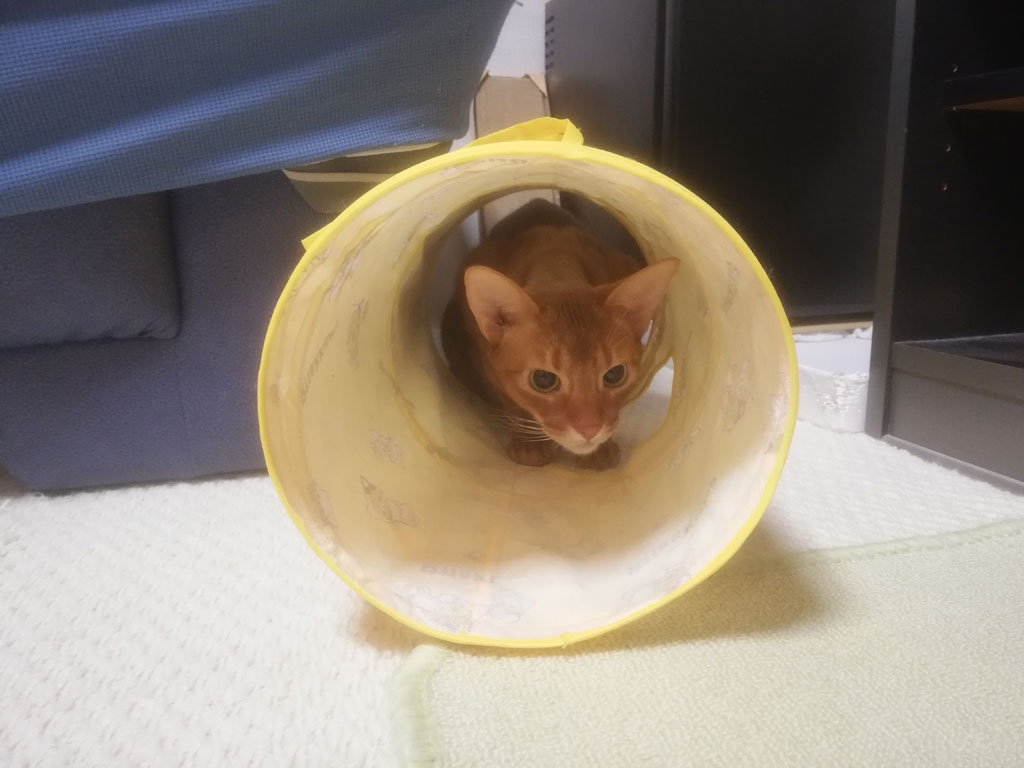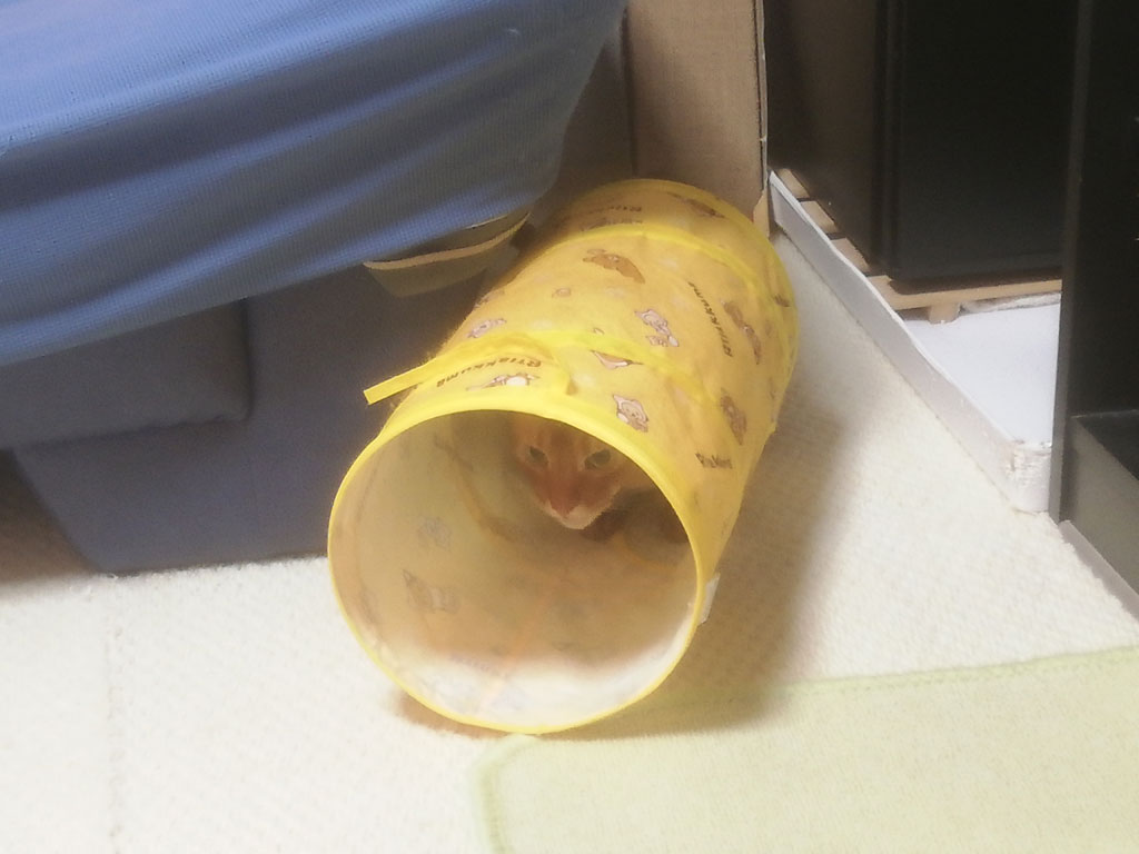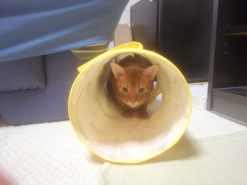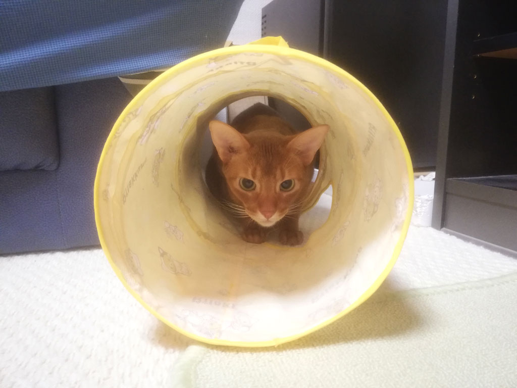私が2階のこっち側の猫トイレを掃除している時、アビのすけは毎朝、ほぼ100%の確率でこのトンネルに入って、私の行動を目で追っているのです…、そして、隙あらば、私の掃除中にそのトイレに駆け込んでくるのです。(汗)