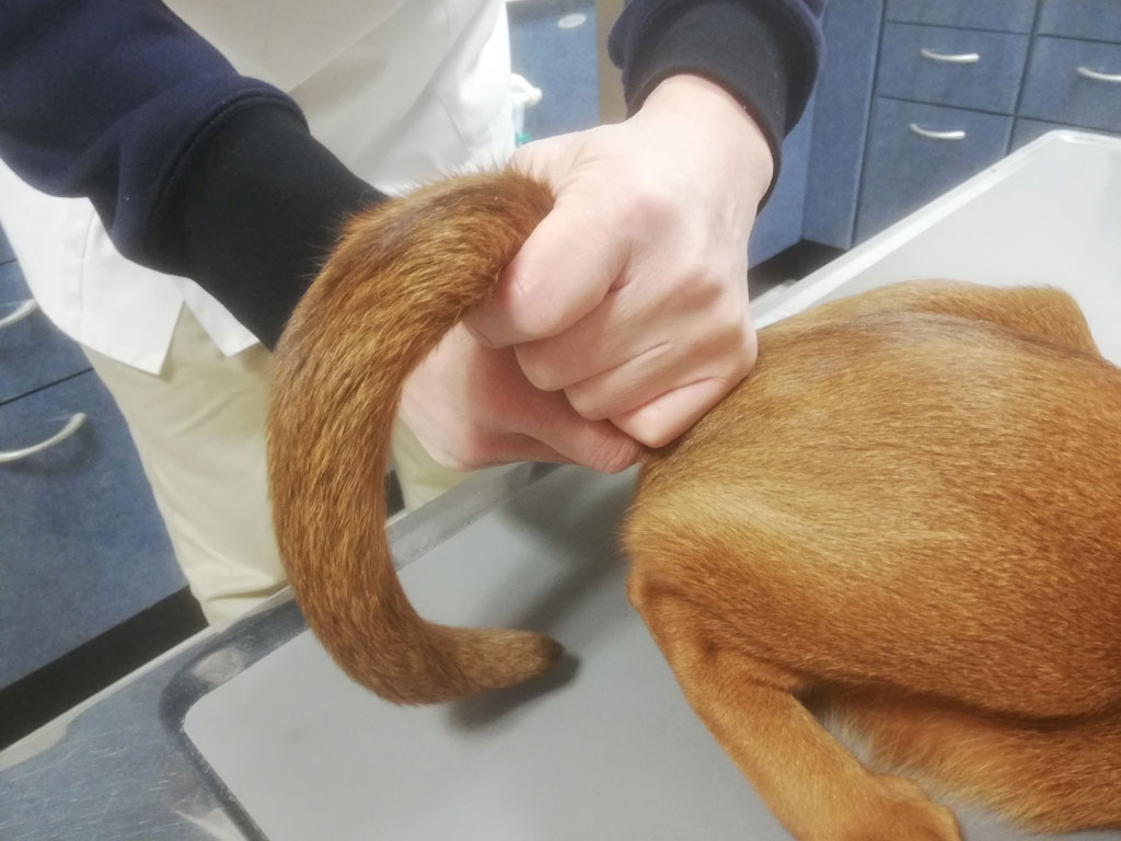 この写真からの動物病院内での写真3枚は、奇跡的にボケなかった写真…、アビのすけの肛門にブスっと体温計を挿して、アビのすけの体温は37.6度。