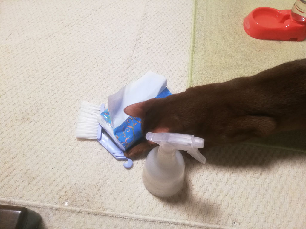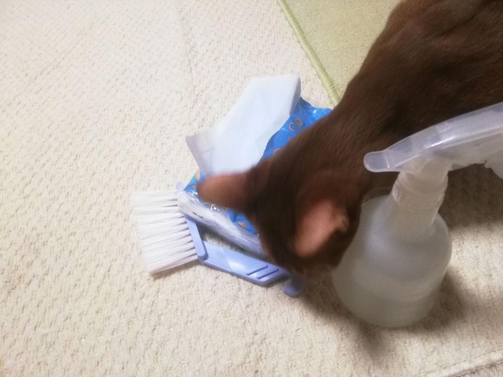 これは、3日前の2/9(土)の朝7時半過ぎ、私が2階に猫トイレの掃除に上がったら、またまた、アビのすけが1階から私のストーカーを…、それでやはり、ミニほうきに悪戯してやがった…。(汗)