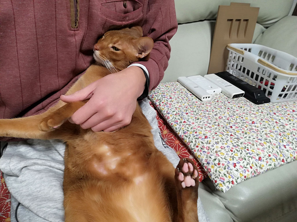 これは、3日前の2/11(月)の建国記念日の晩のアビのすけ君…、新たな皮膚炎ができていないか、チェックしました。
