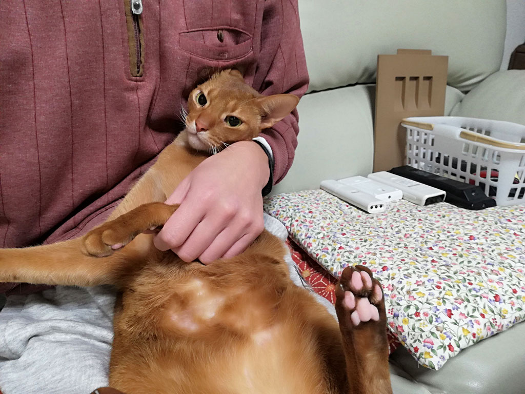 笑えるアビのすけ君…、拘束されるのが大嫌いなアビのすけですが、力づくで私に抑え込まれたら、どうする事も出来ず。