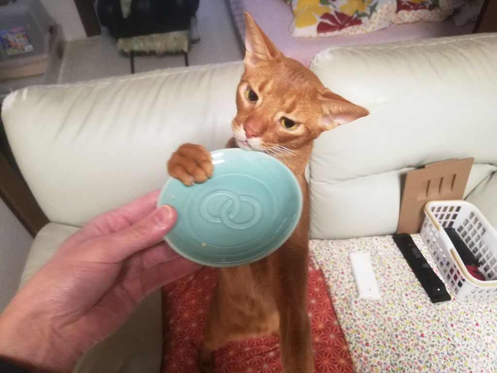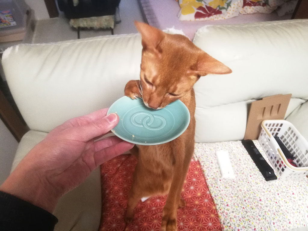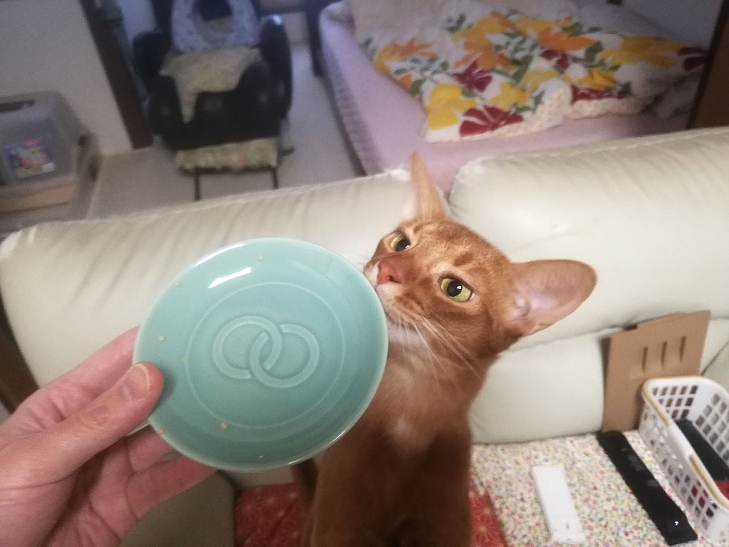 この時、ロシ子が超・食欲不振になっていて、色々な缶詰やパウチを開けたは全く食べてくれず、その残飯をアビのすけに食べさせていて、この時は美味しいものが食べれると必死のパッチだったアビのすけ君。