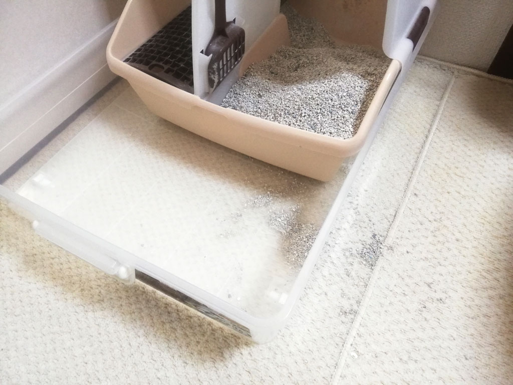 そしてこれは、その日の午後3時半頃…、たまたま2階に上がったら、猫砂がばら撒かれまくっていました。