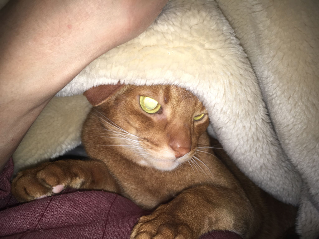 ソファーで寝る私のかけ布団の中に入って来たアビのすけ君。