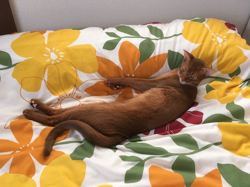 伸びて寝る様になったアビのすけ君…、暖かくなって来た証。 コメントを残す 今日はロシ子のブログで手間取ったので、アビのすけのブログは写真を2枚だけ。 これは、3日前の5/11(土)の午後3時前の事でしたが、2階の私のベットの上で、アビのすけ君が伸びて長くなって寝ていました。 暖かくなって来たらこの体勢で寝始めるアビのすけ君。 それにしてもアビのすけ君、君は一体、何頭身美人なんだい…、ほんと、頭が小さくてシュッとしているアビシニアンのアビのすけ君です。(笑)