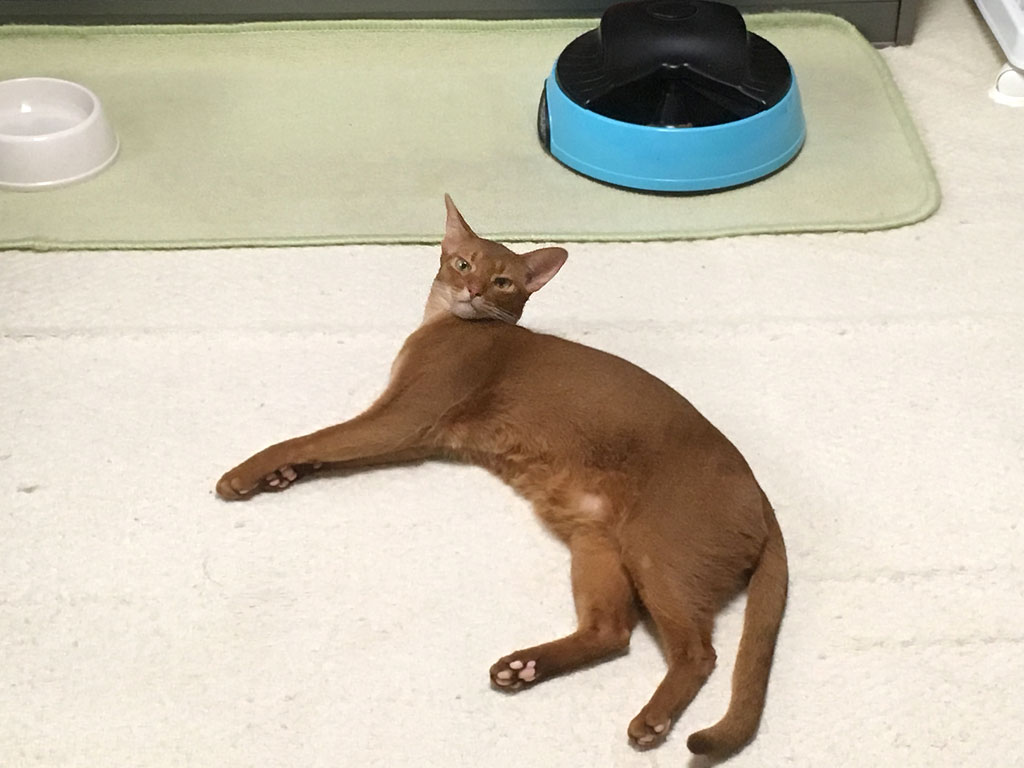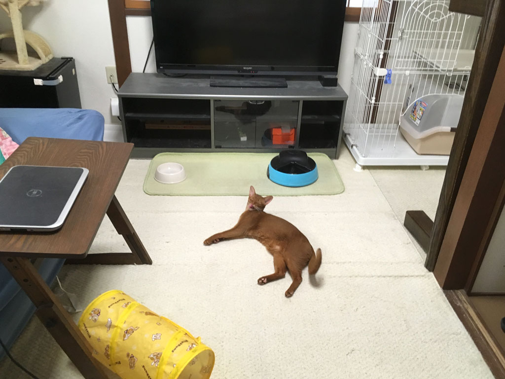 私がポロシャツを着ようとアビのすけをどけたら、アビのすけがここでごろん。
