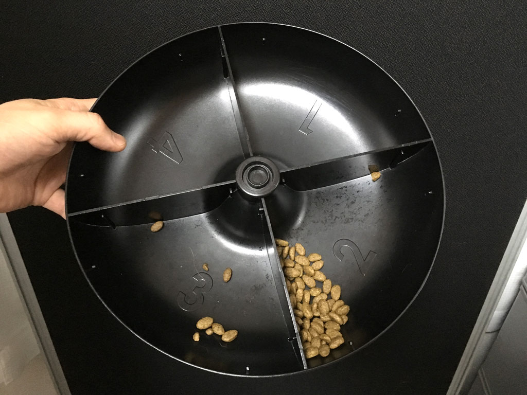 話はガラッと変わりますが、これ、この日の晩8時前、私がランニングに出る前に2階のアビのすけの自動給餌器のトレーをピックアップした状況ですが、②は朝ご飯のカリカリの22gで、③は昼ご飯の12gのカリカリ。