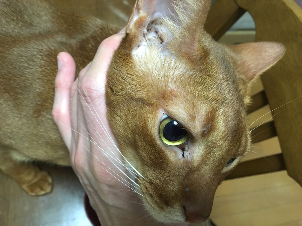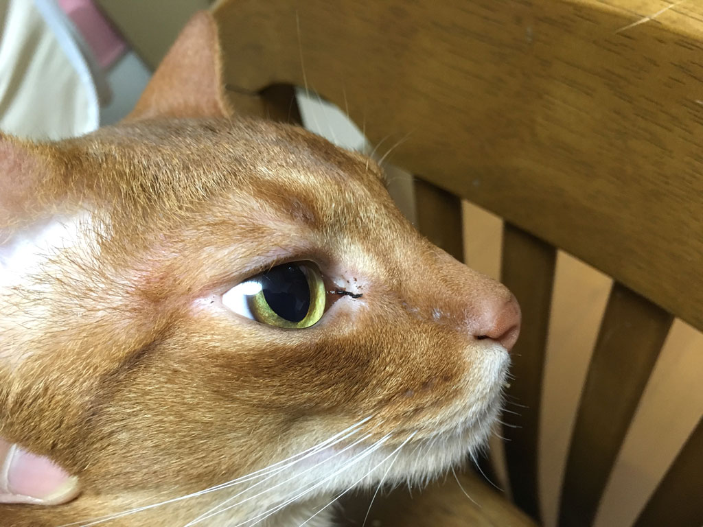 アビのすけは元気一杯の男の子で、普段から狭い家の中を全力で走っているので、どっかにぶつけてしまったのかな…、いやいや、そんなどん臭い事はなく、多分、右足で掻き掻きして傷が付いてしまったのだろう…。