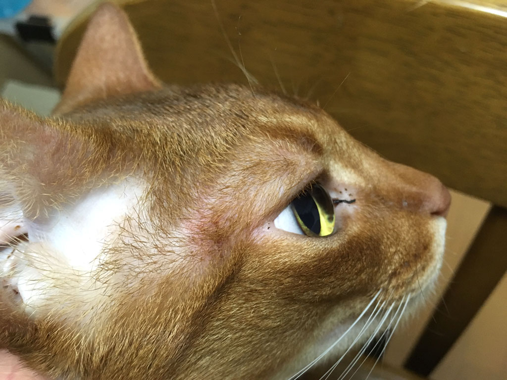 これは、おとといの晩10時過ぎの事でしたが、アビのすけの顔を見ていたら、アビのすけの右目の上の所が赤くなっていて…。
