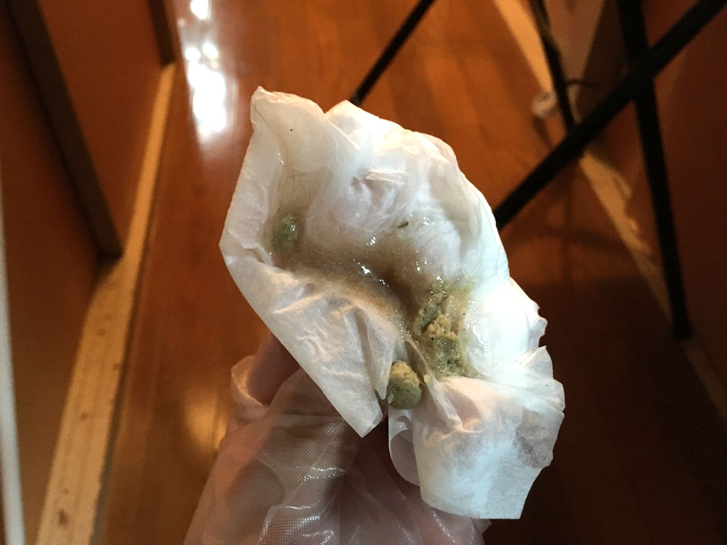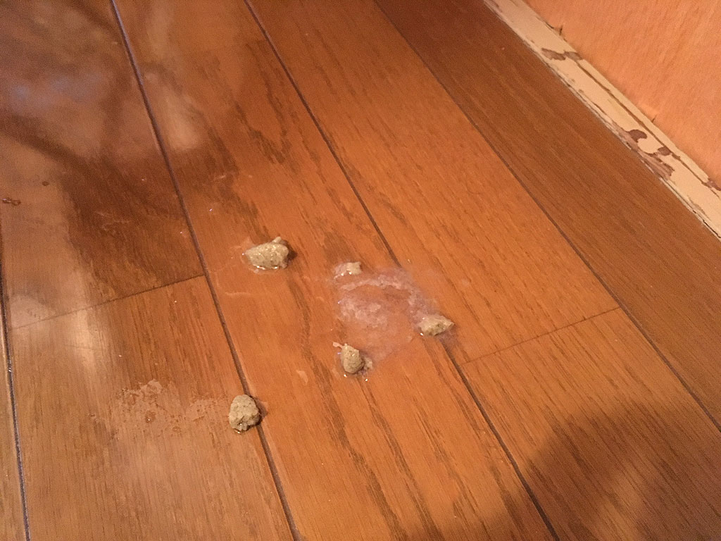 これは今朝の5時半の事、未明からの一作業を終えて部屋を出たら、暗い中、廊下に吐いた跡が…。