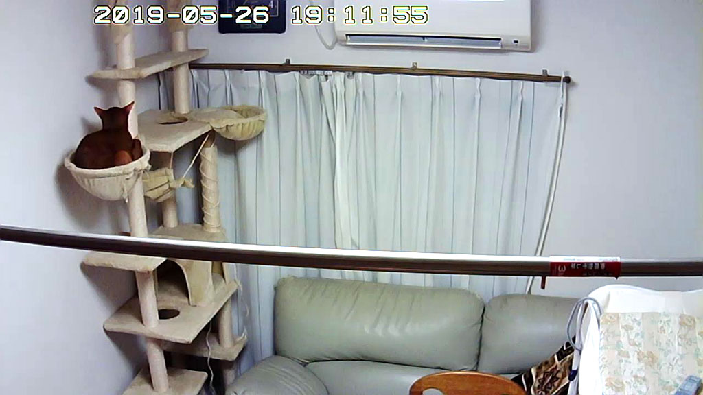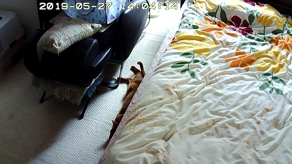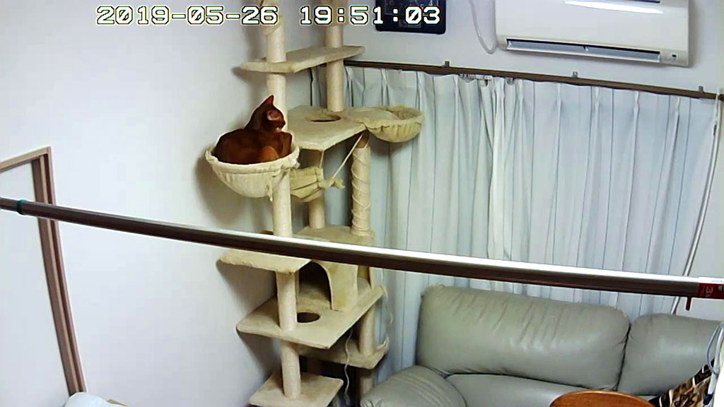 この時、Webカメラで2階の温度計をチェックしてみると、温度は34℃位かな…、私はもう、日中は2階で寝る事ができない暑さになっていて、1階はエアコンを付けていたのですが、2階で伸びて寝ていたアビのすけ君。